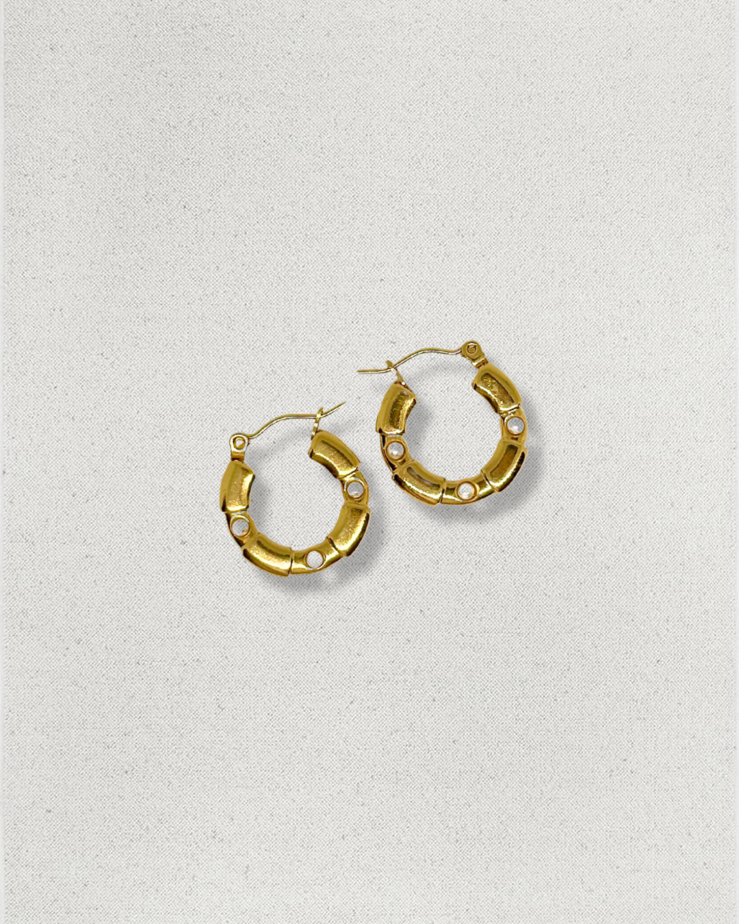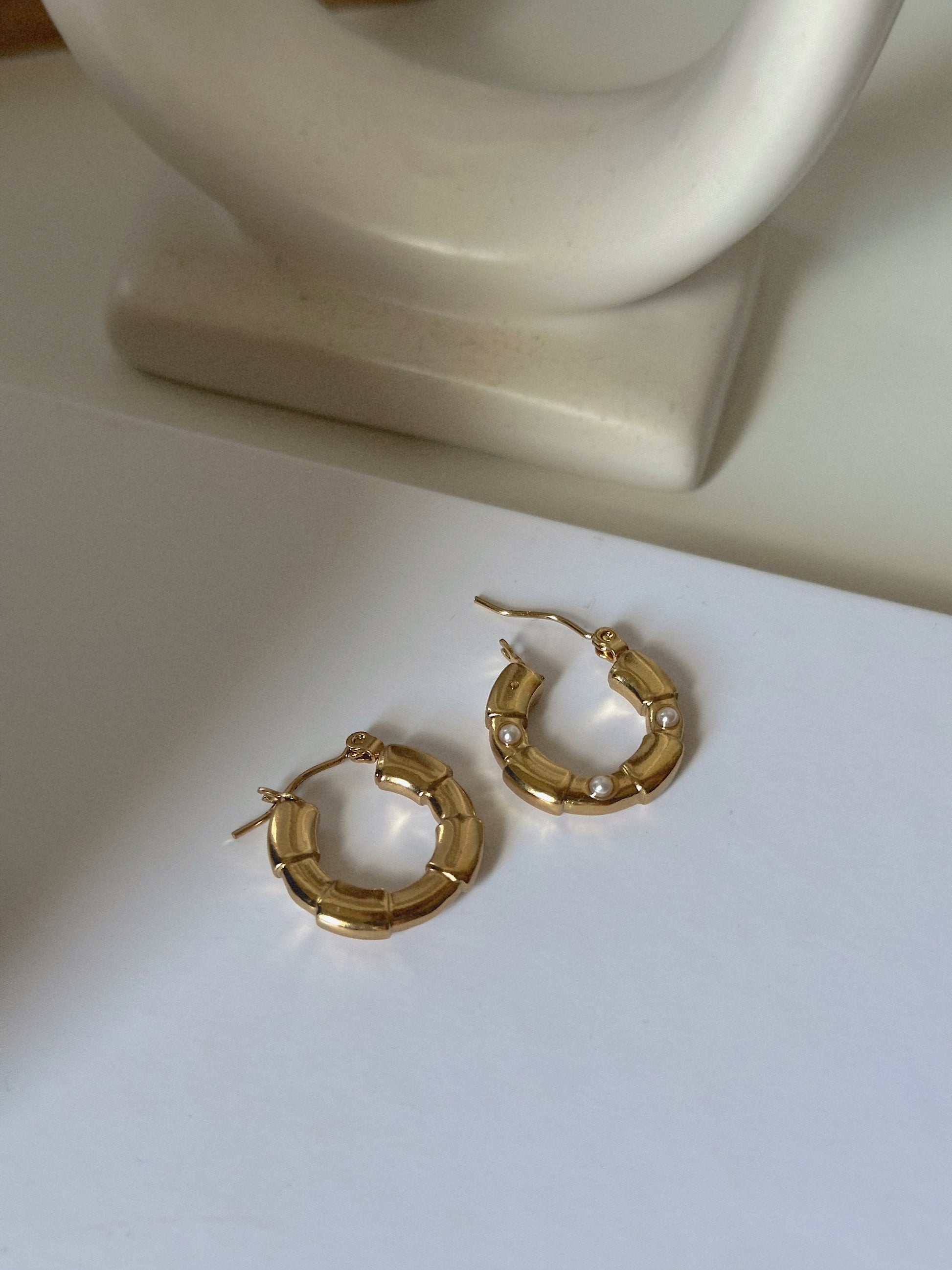 Pendientes aros cerrados pequeños, de acero inoxidable y baño de oro y mini perlitas en laterales.