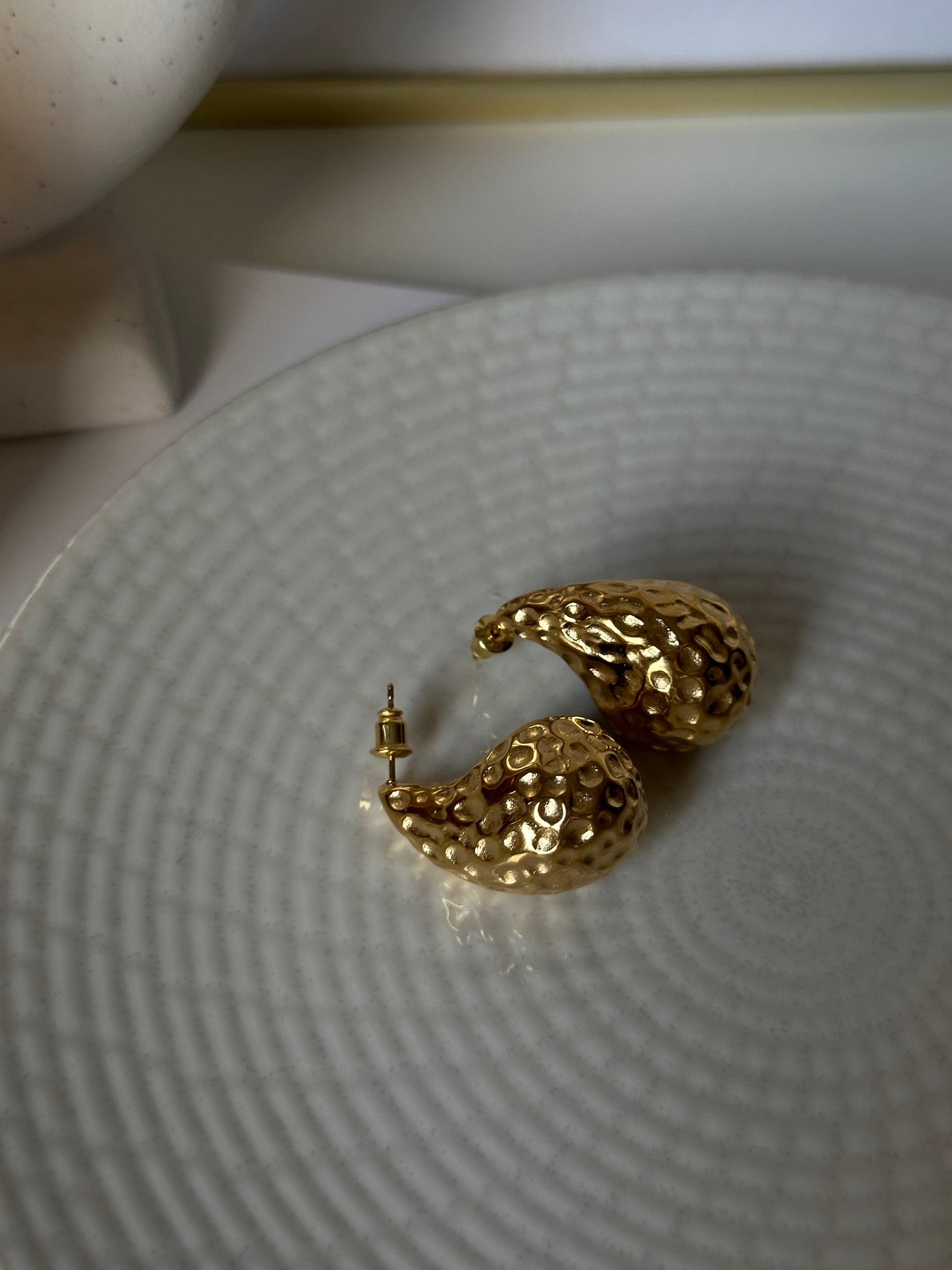 Pendientes en tendencia en forma de lágrima, en este caso labradas, de acero inoxidable y baño de oro de 18K.
