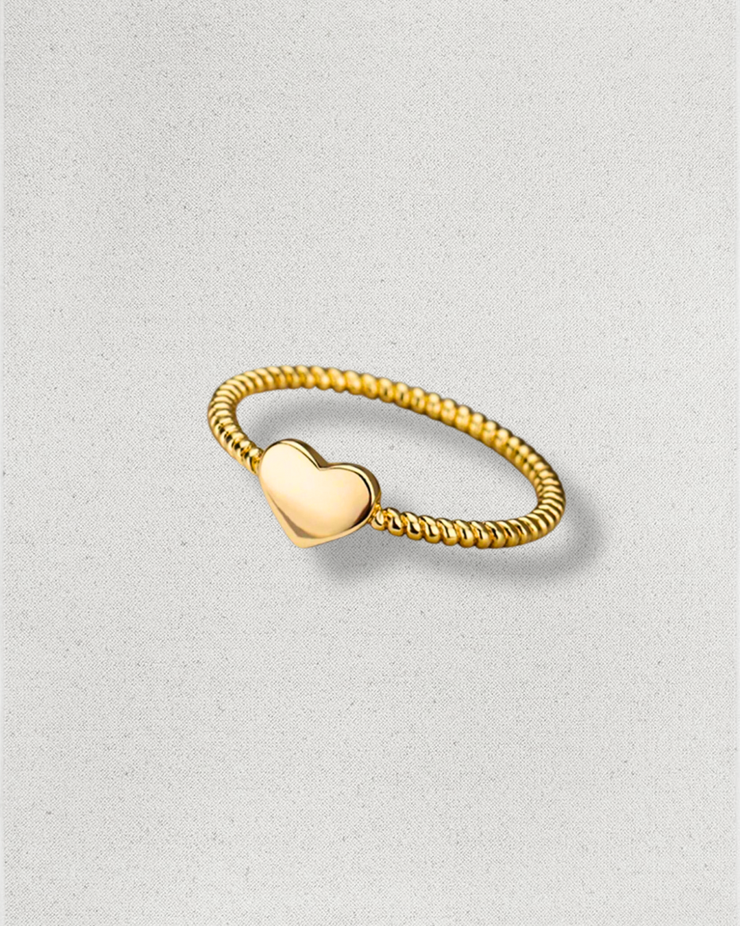 Descubre la delicadeza de nuestro anillo de plata con corazón, una joya minimalista ideal para el día a día. Su diseño con aro trenzado y un corazón liso en el centro lo convierte en un accesorio y y versátil. Fabricado en acero inoxidable y baño de oro, es perfecto para usar solo o combinar con otros anillos