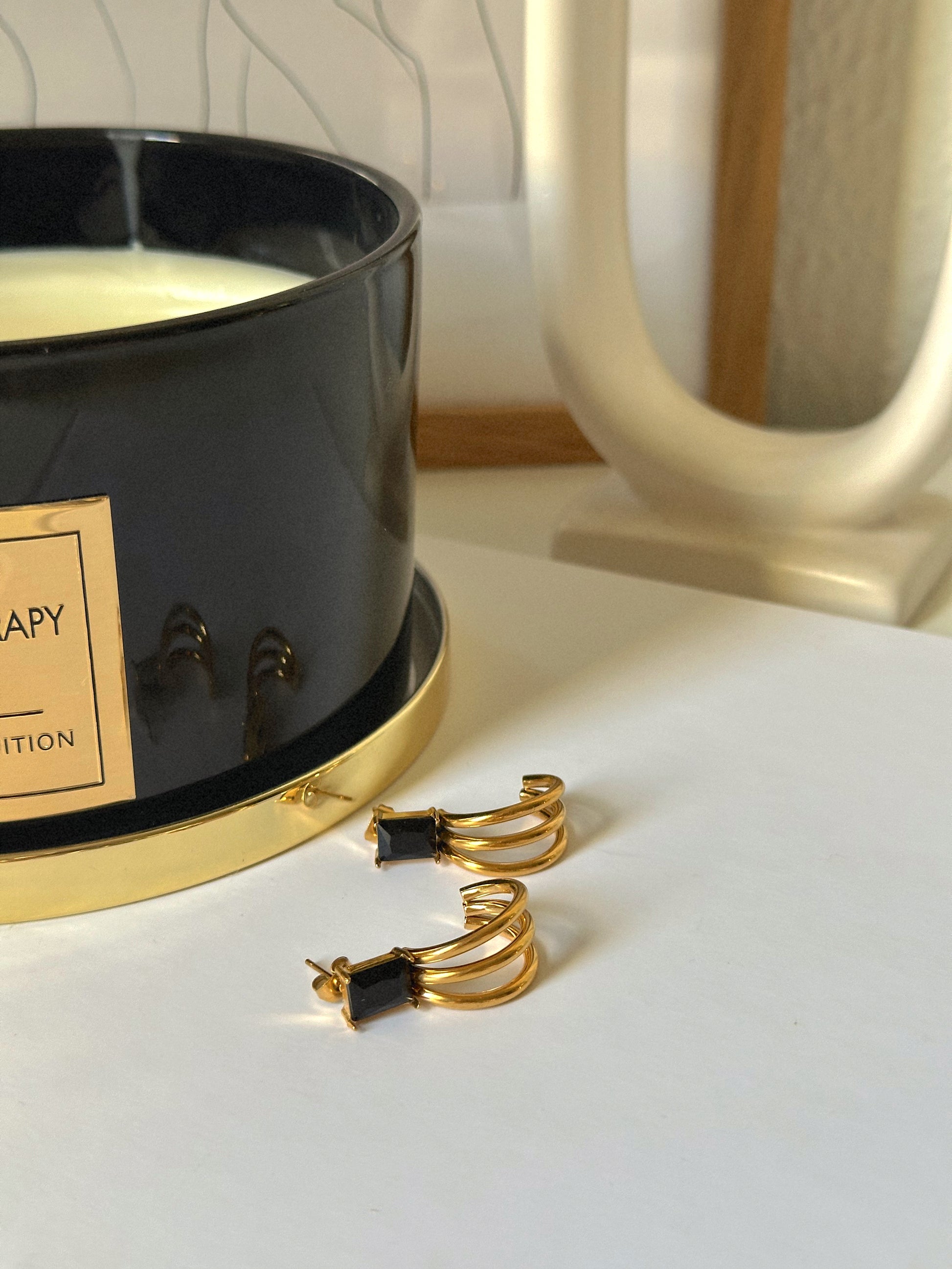 Pendientes de acero inoxidable y baño de oro, en forma de aro y cristal negro.