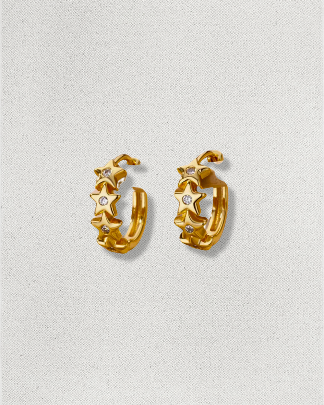 Pendiente para piercing, en forma de aro y estrellas con circonitas brillantes, fabricado en acero inoxidable y baño de oro de 18K.