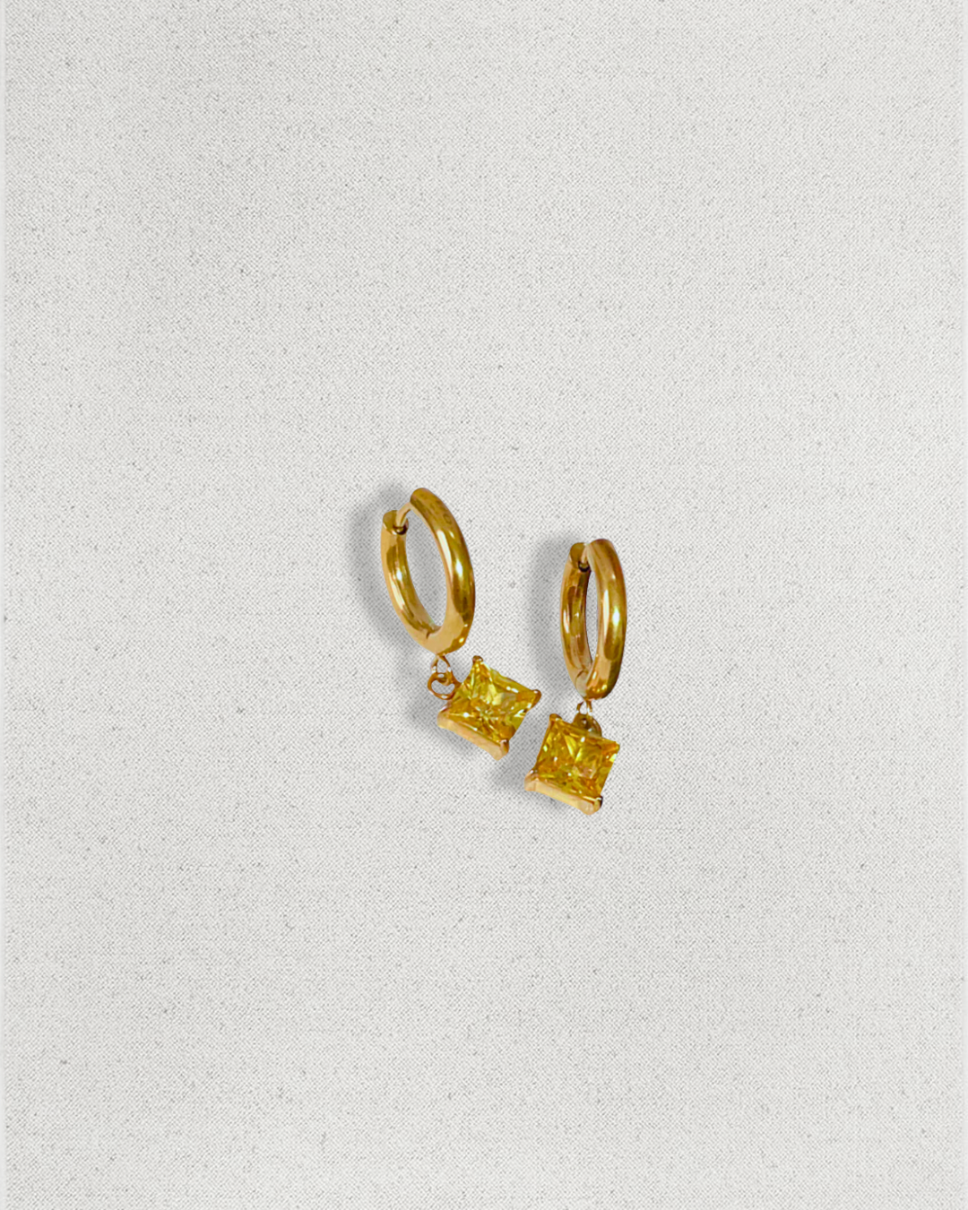 Pendiente para piercing, fabricado en acero inoxidable y baño de oro de 18K, con circonitas de color ámbar.