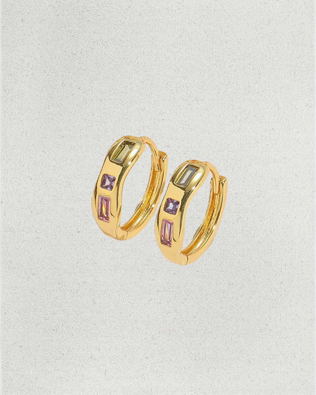 Pendiente para piercing, en forma de aro fabricado en acero inoxidable y baño de oro 18K, con circonitas de colores en tonos pastel.