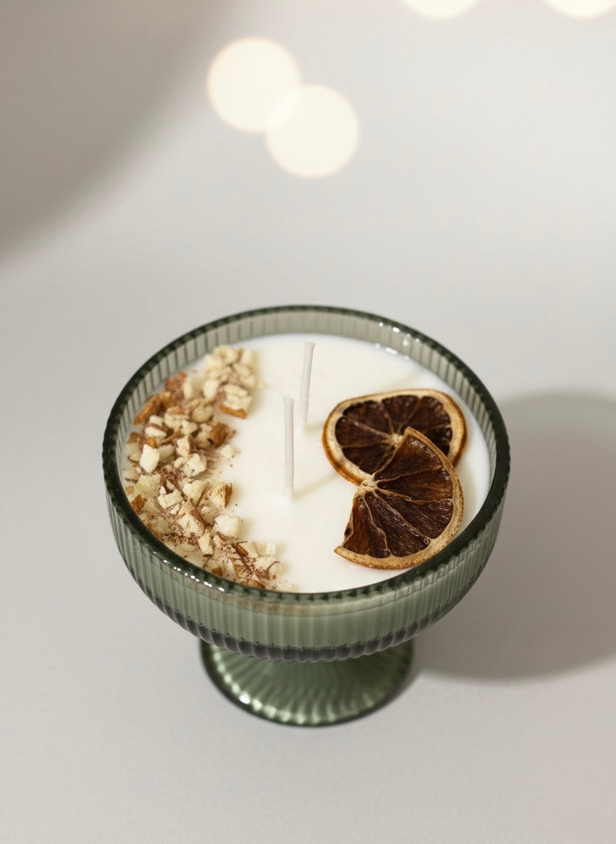 Envuelve tu hogar en la calidez navideña con esta vela de soja copa en cristal verde labrado. Su aroma a Turrón de Jijona, unido a la decoración de naranja disecada y almendra natural, transforma cualquier rincón en un espacio cálido y sensorial. Elegancia, aroma y diseño en una pieza única.
