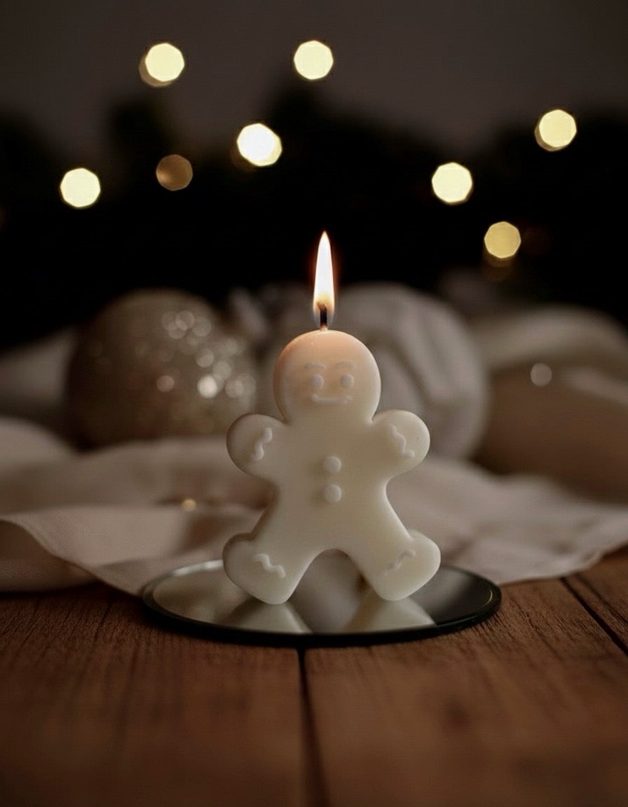 Mini vela decorativa con forma de galleta de jengibre, hecha a mano con cera de soja 100% natural. Su diseño adorable y festivo la convierte en el detalle perfecto para añadir un toque navideño cálido y encantador a cualquier espacio.