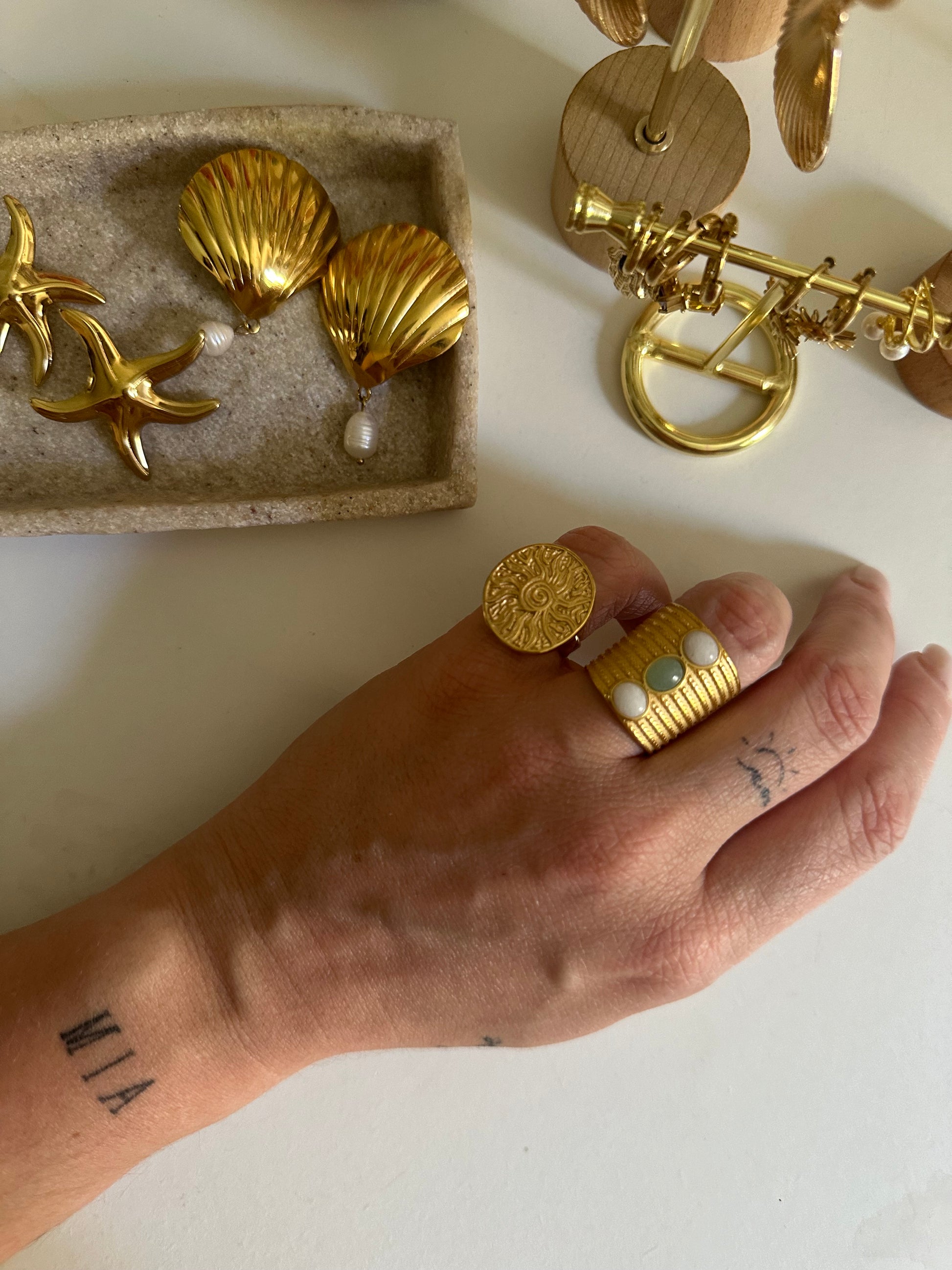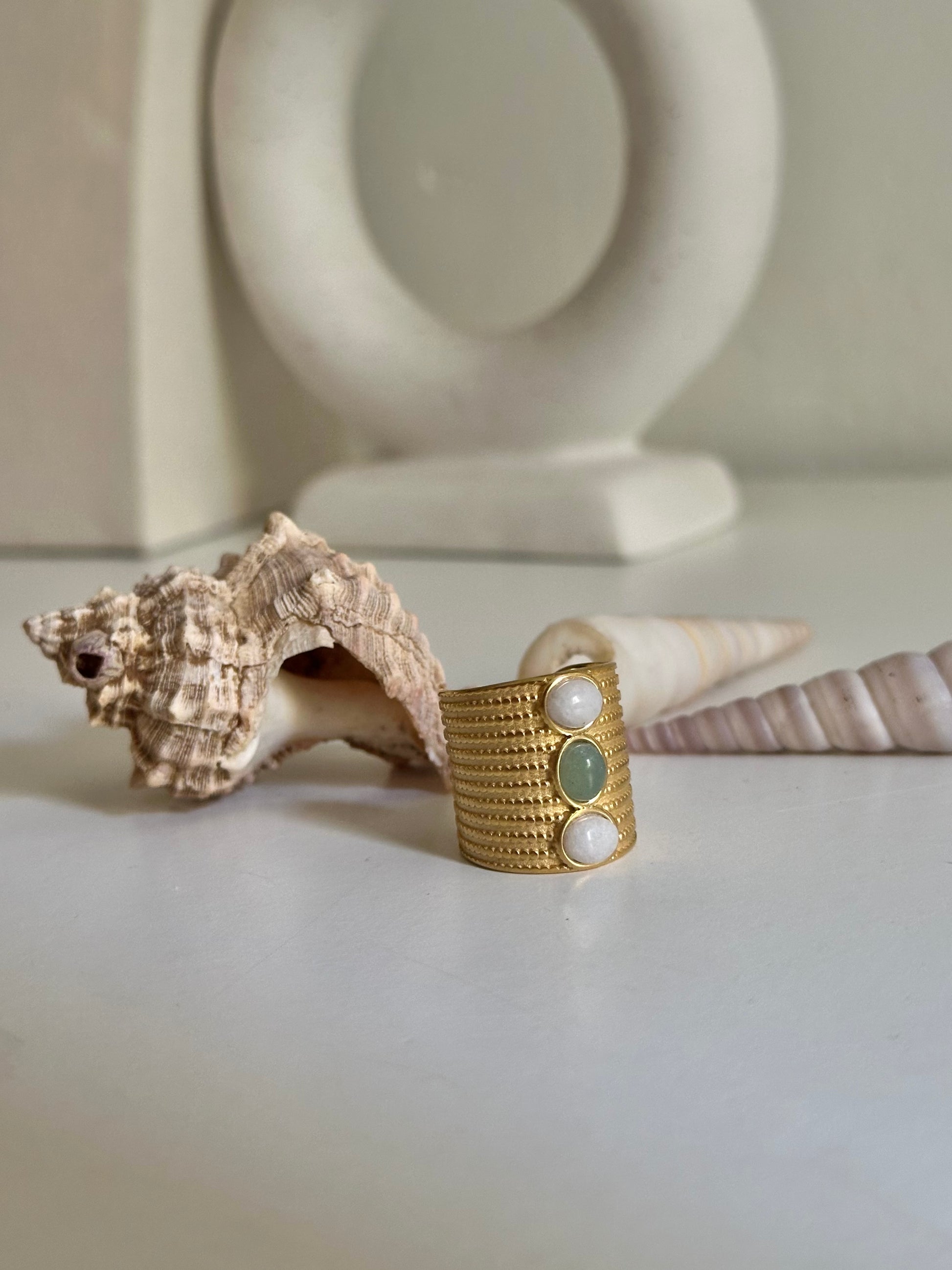 Anillo con diseño de tres piedras, fabricado en acero inoxidable y bañado en 18K.