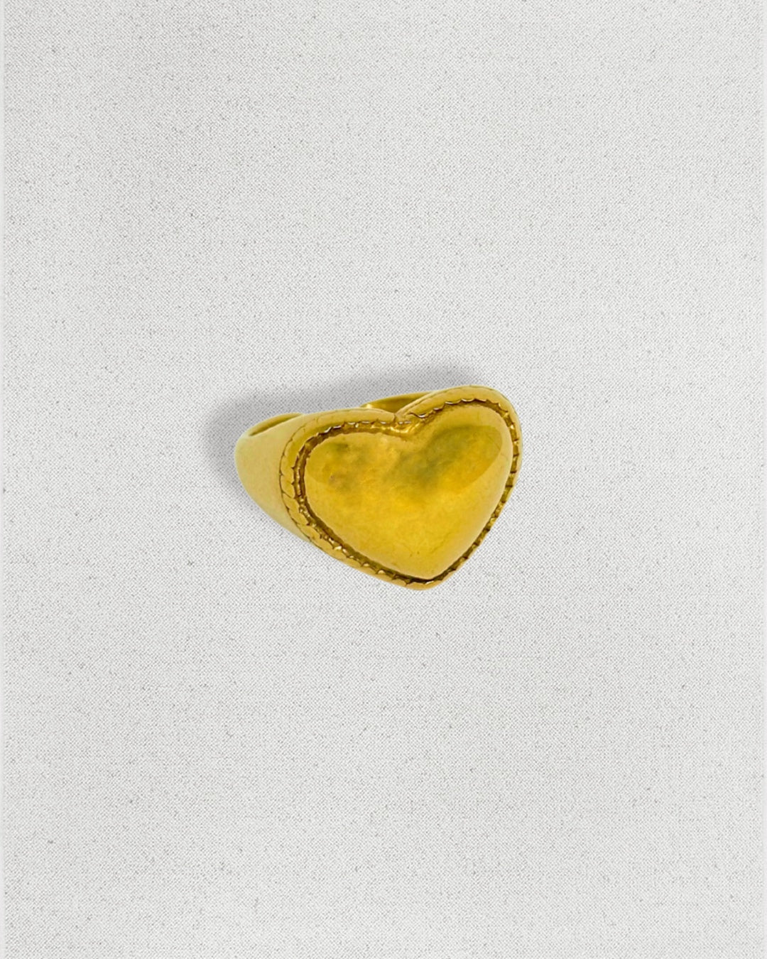 Anillo con diseño de corazón, fabricado en acero inoxidable y baño de oro de 18K.