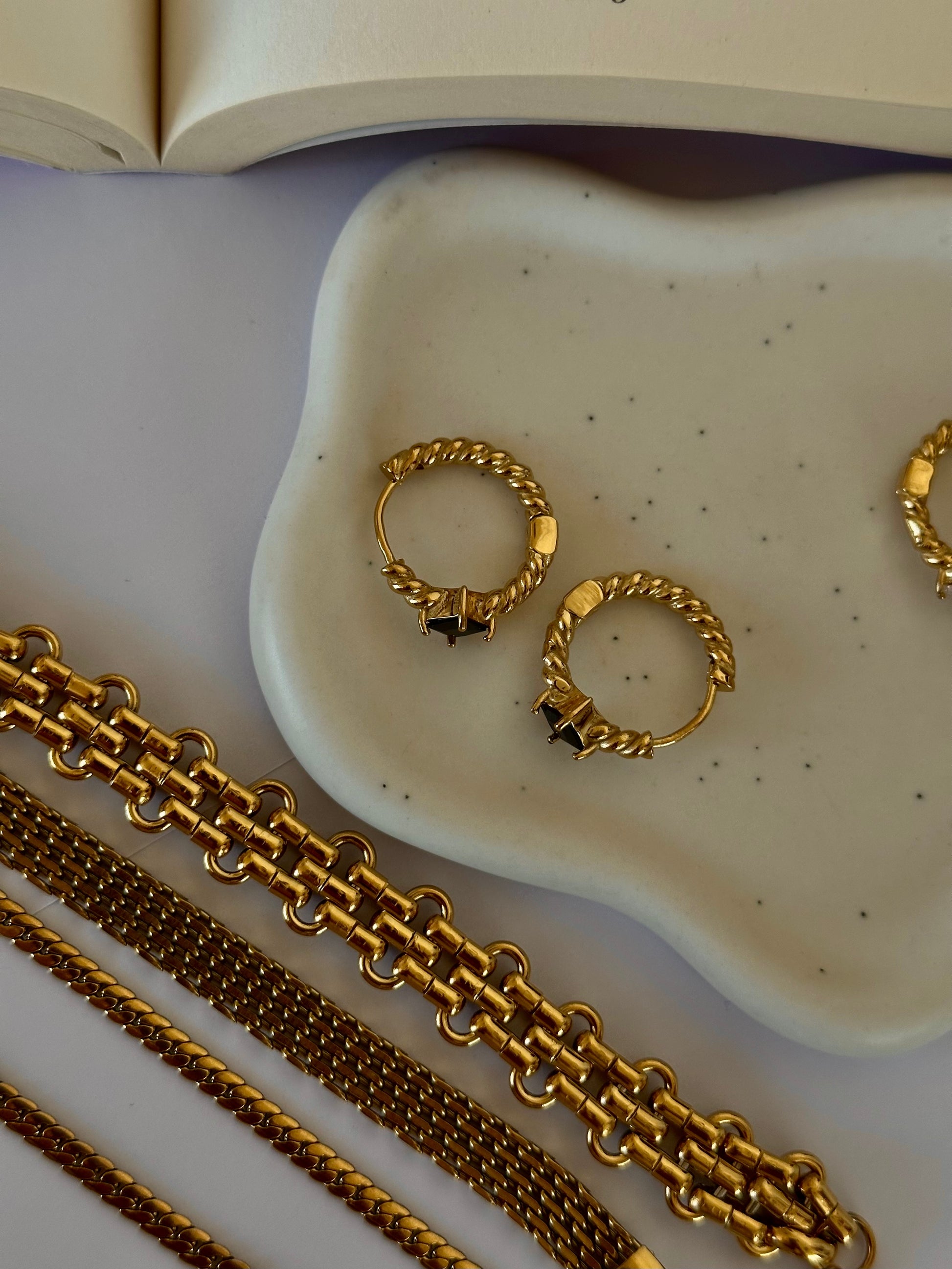 Estos aros destacan por su textura trenzada, que añade un toque artesanal y distintivo a su diseño. En el centro, una circonita negra resalta con elegancia, aportando un contraste sutil pero impactante. La combinación de su acabado trenzado y el brillo profundo de la piedra crea un equilibrio perfecto entre lo clásico y lo moderno. Ideales para elevar cualquier look, estos aros son versátiles y sofisticados, perfectos para ocasiones tanto formales como casuales, añadiendo un toque de lujo discreto.