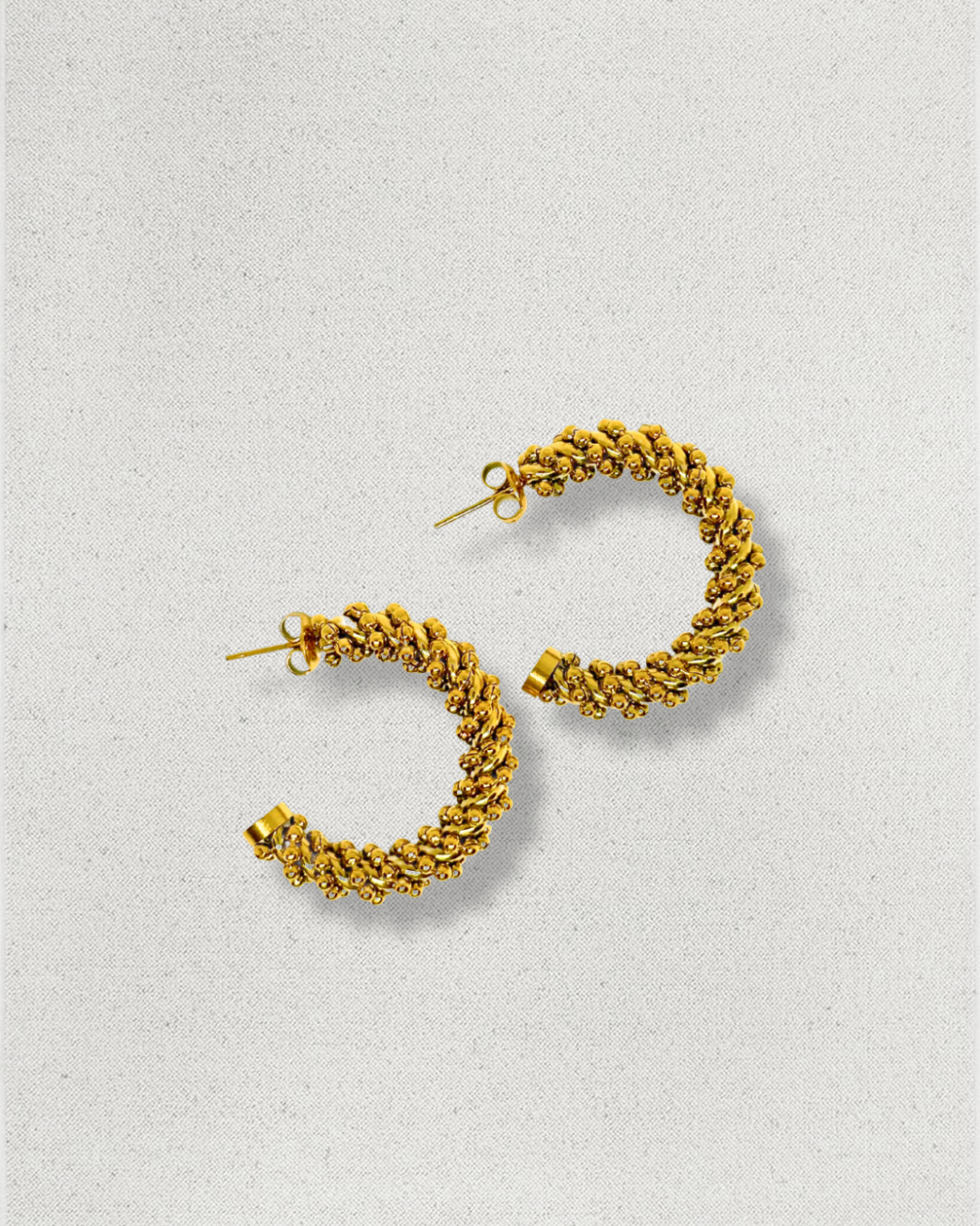 Aros de acero inoxidable y baño de oro, con mini bolitas que lo forman.