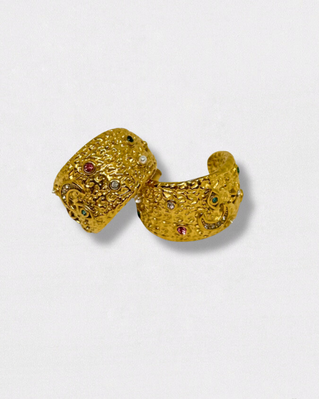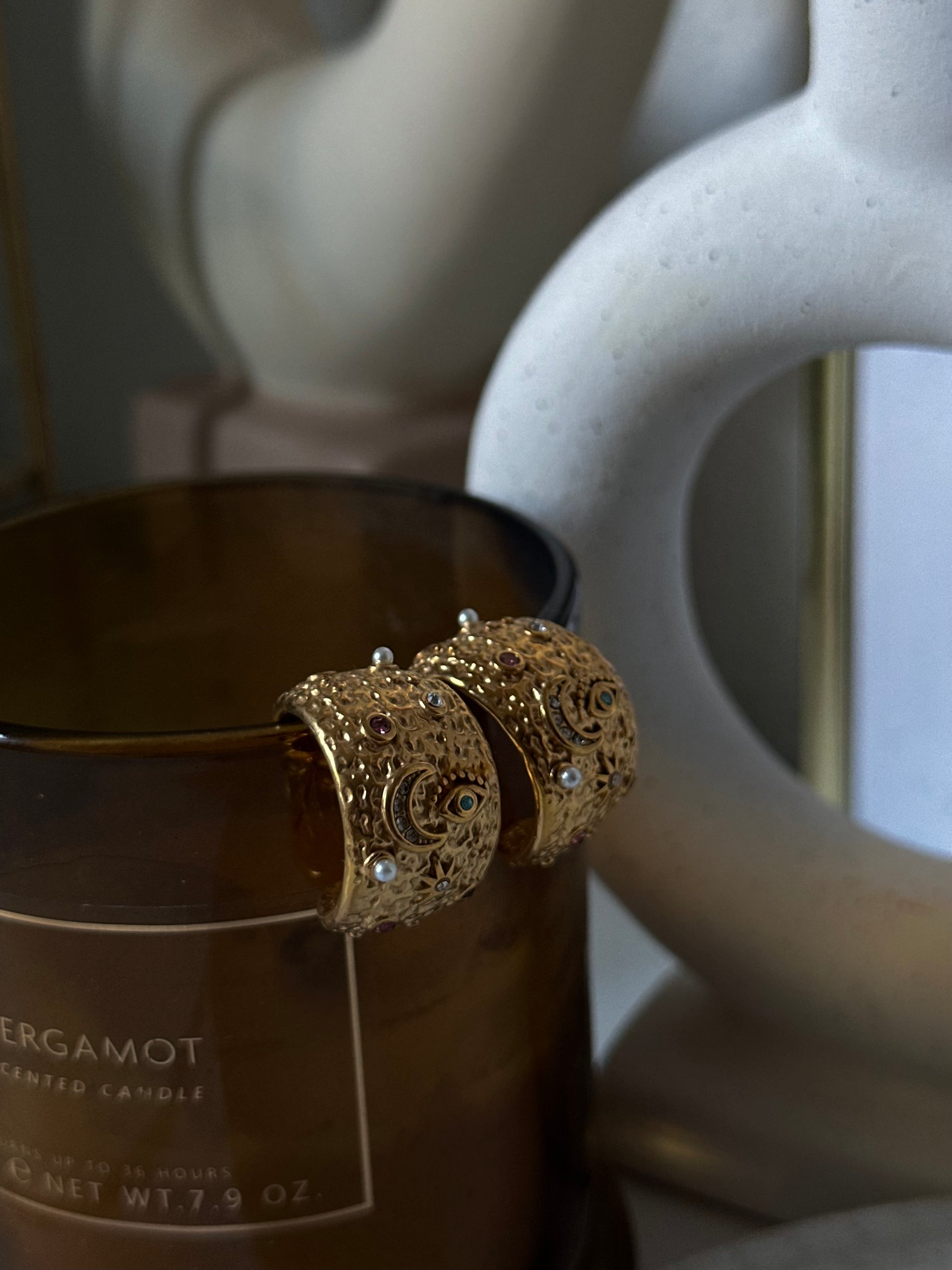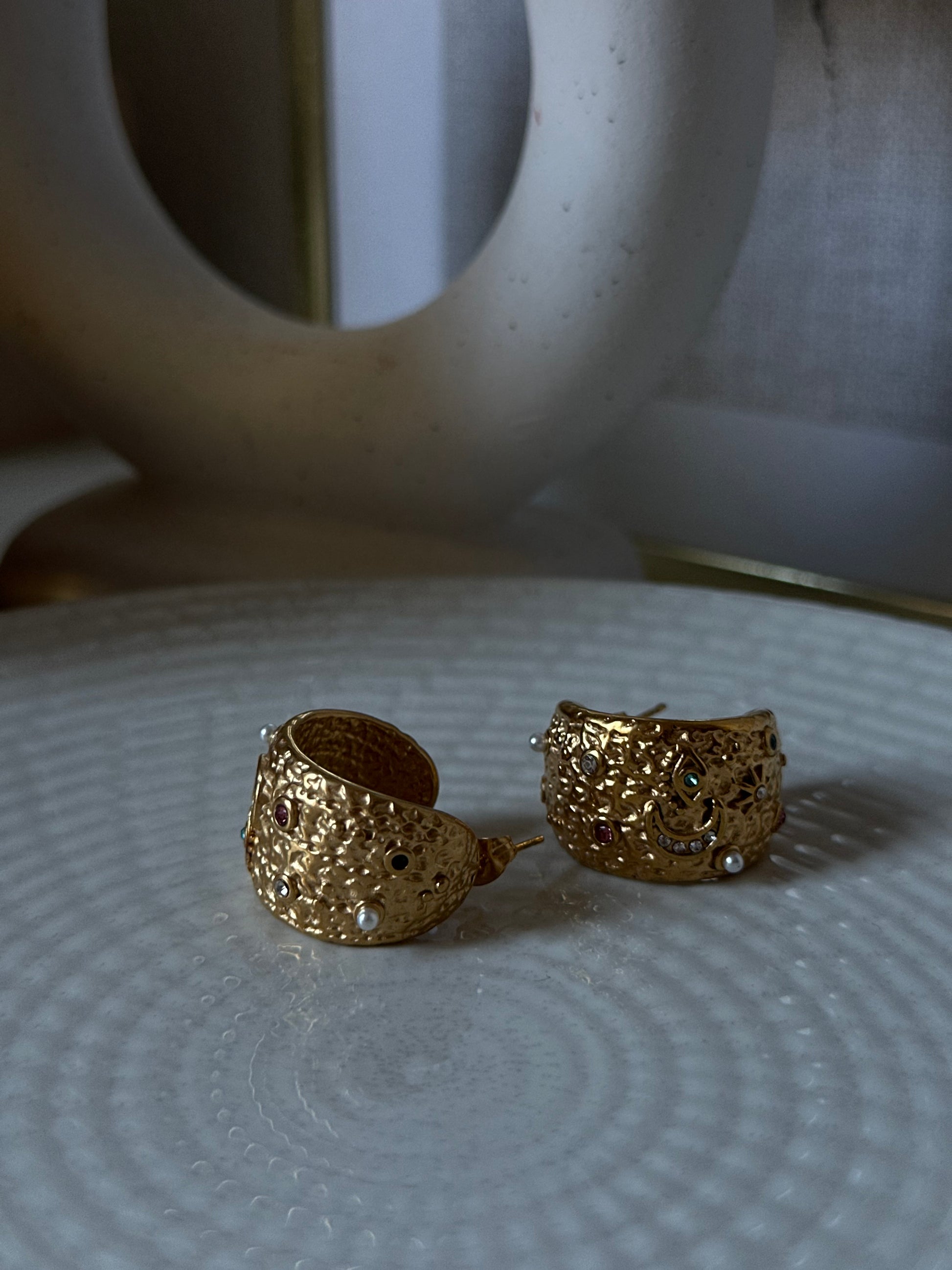 Preciosos aros labrados con brillantes multicolor, con dibujo de luna y ojo turco.