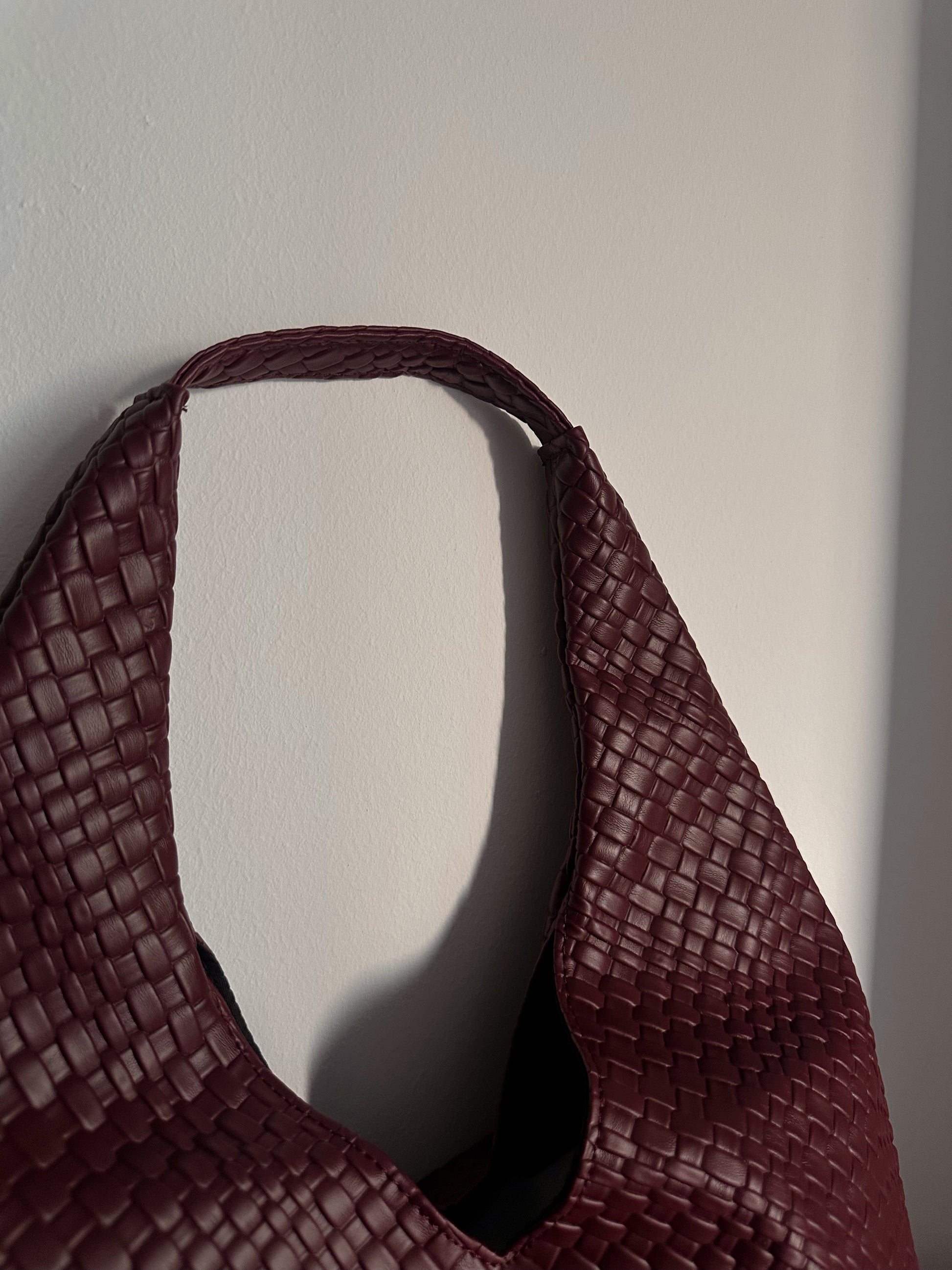 Su silueta triangular con efecto piel trenzada aporta un aire sofisticado y moderno, convirtiéndolo en una pieza única que eleva cualquier look. El tono burdeos profundo añade calidez y distinción, ideal para combinar con colores neutros o contrastar con tonos claros.