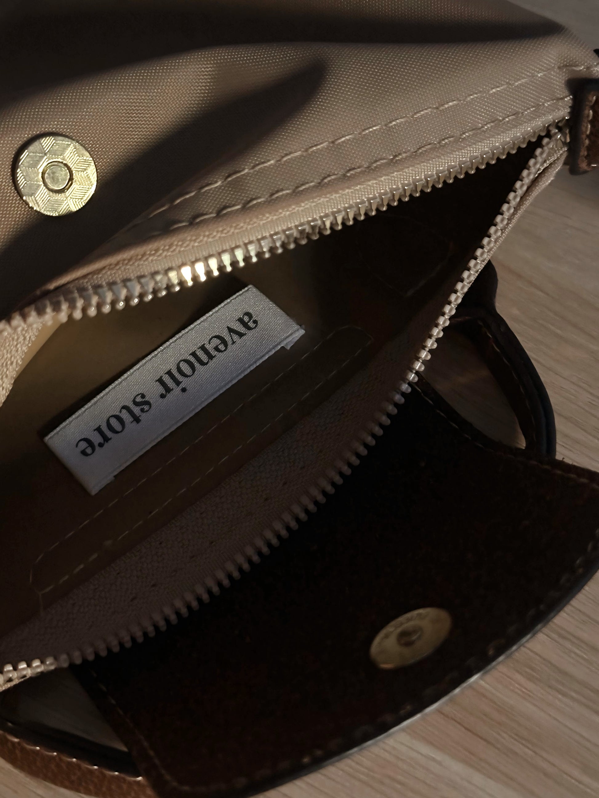 - Color: Camel con solapa y asas marrón.