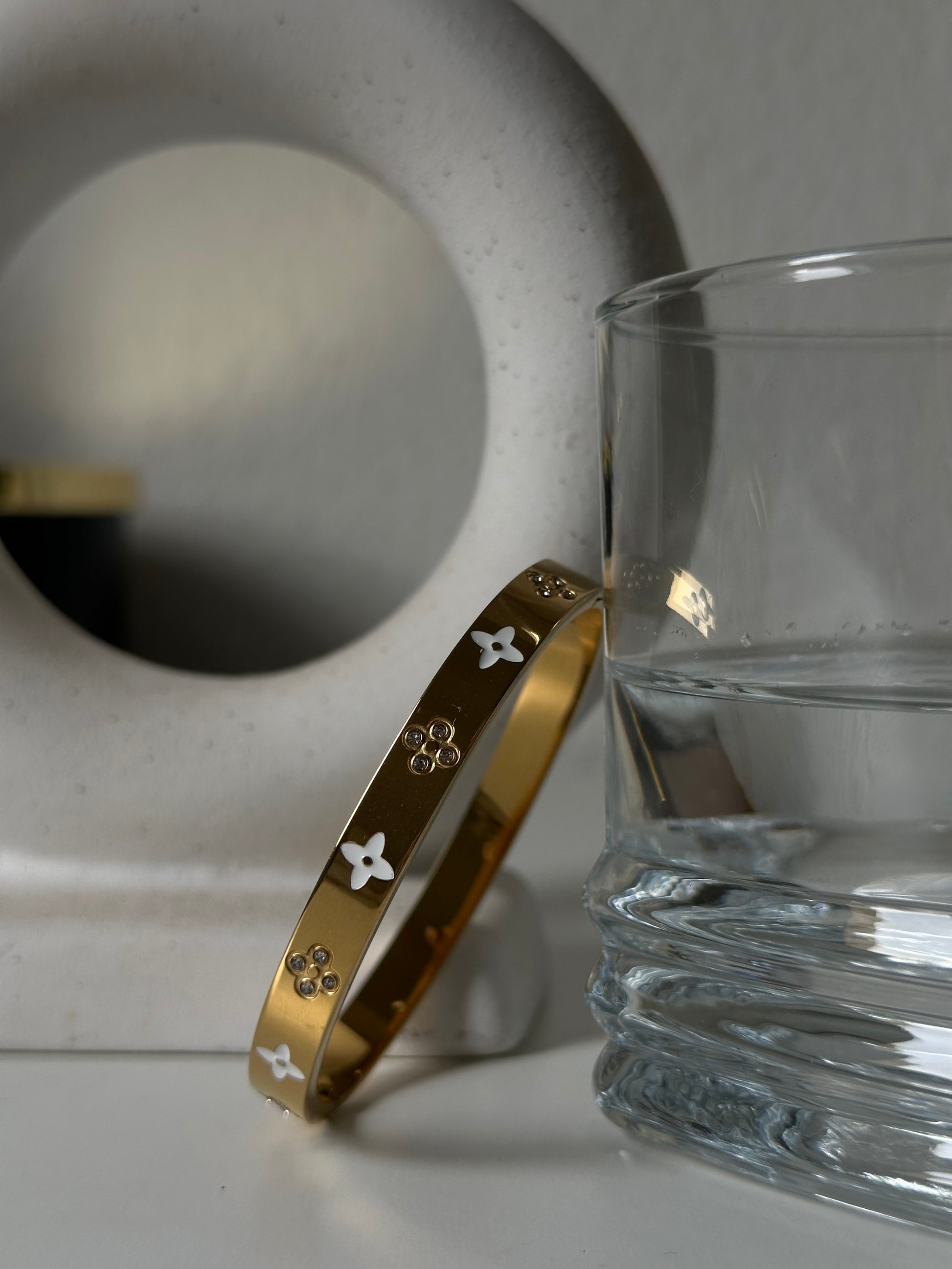 Precioso brazalete de acero inoxidable y baño de oro, con diseño de flores y pequeños brillantes.