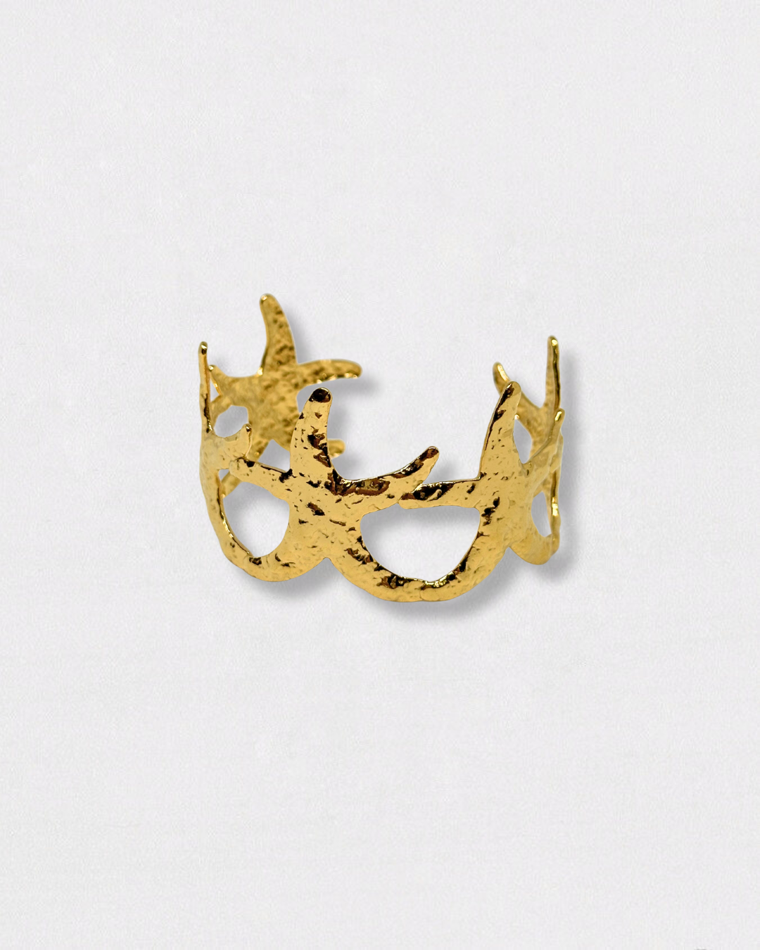 El Brazalete Sirena Dorado, una joya de acero inoxidable bañada en un acabado dorado brillante que combina sofisticación y resistencia. Formado por cinco delicadas estrellas.
