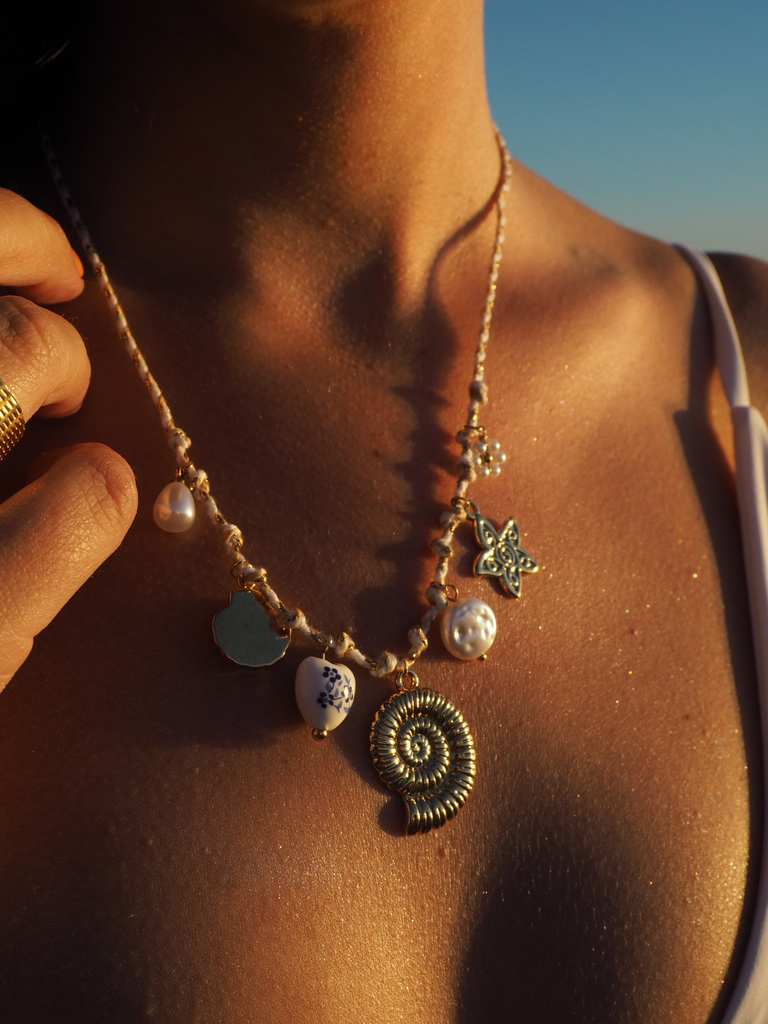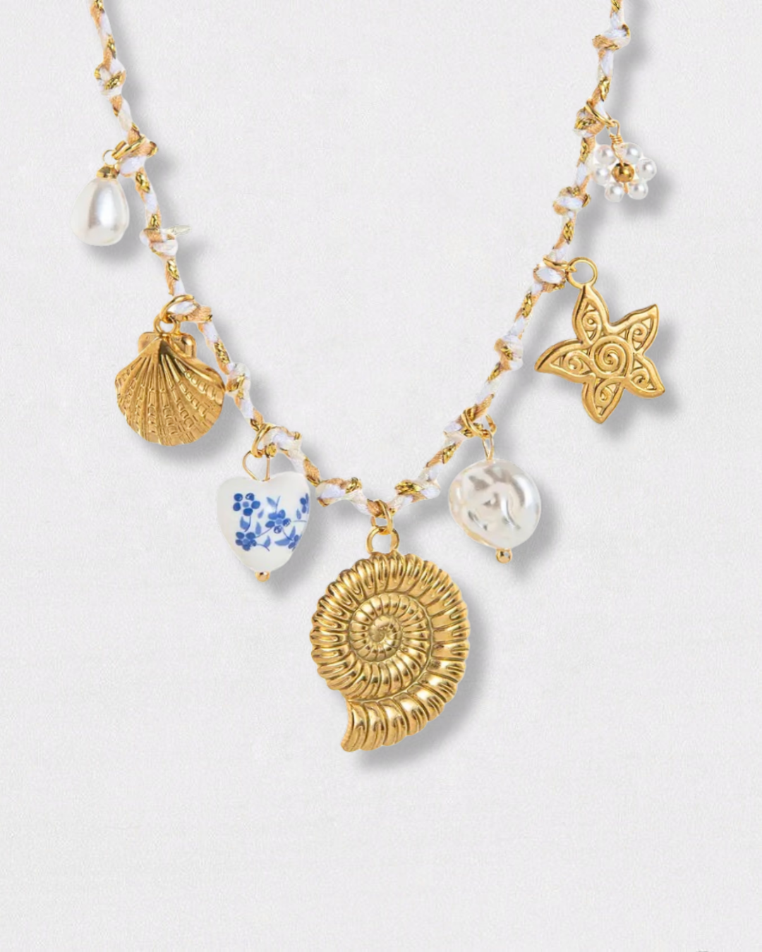 El Collar Bianca Sole es una pieza única que combina delicadeza y estilo en un diseño sofisticado. Con una cadena de eslabones dorados finos, este collar presenta un abanico de charms que incluyen una perla central, un caracol marino, una estrella dorada, una flor de porcelana azul y una pequeña perla en la parte superior. La mezcla de elementos naturales y otros detalles lo convierte en el accesorio perfecto para cualquier ocasión.