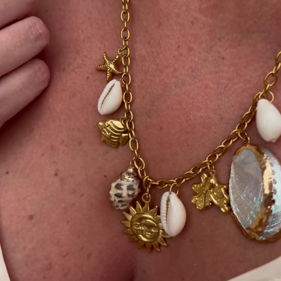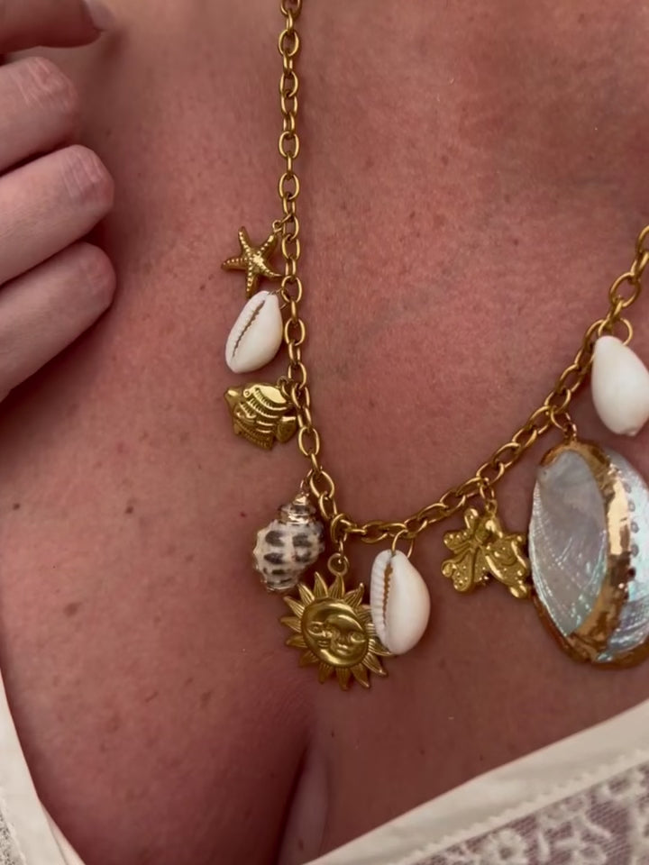 Sumérgete en la esencia del verano con el Collar Calma Dorata, una pieza única inspirada en la calma del mar Mediterráneo y la calidez del sol. Esta joya combina conchas naturales, un gran nácar iridiscente bordeado en dorado, y pequeños amuletos bañados en oro como el sol, la abeja y el pez.