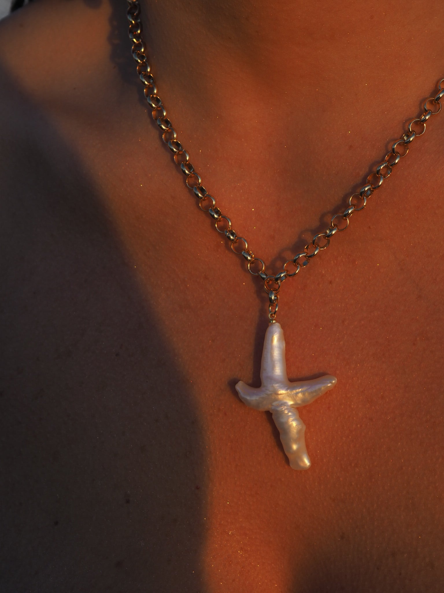El Collar Croce Bianca combina una poderosa cruz tallada en nácar con una cadena de eslabones dorados en acero inoxidable. Cada pieza es única, con formas orgánicas e irregulares que evocan la esencia del mar y lo sagrado de lo imperfecto.