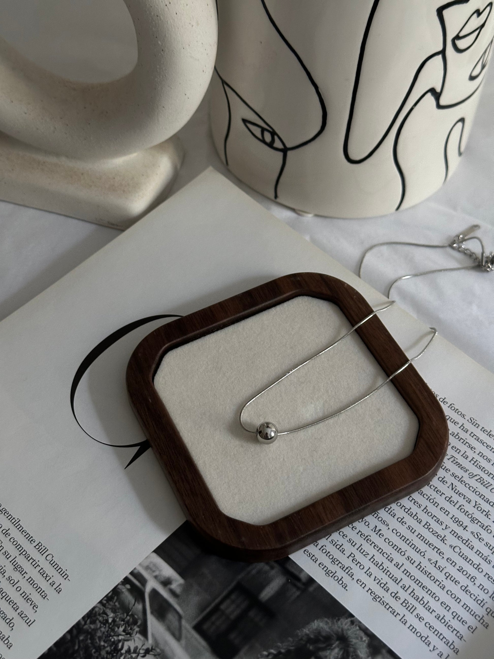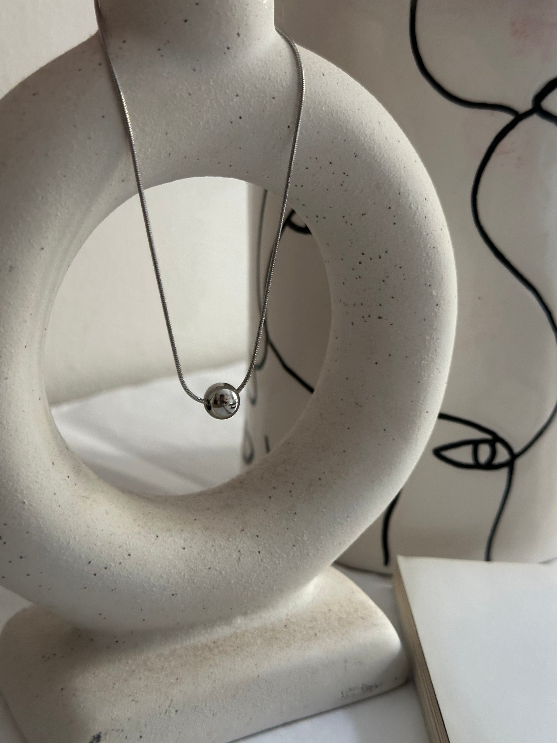 El collar con esfera de plata es la u de sofisticación minimalista. Su diseño limpio y moderno resalta la belleza de las formas simples, convirtiéndolo en un accesorio versátill y atemporal. Elaborado en acero inoxidable y baño de plata, presenta una cadena fina y una esfera pulida con un brillo sutil.