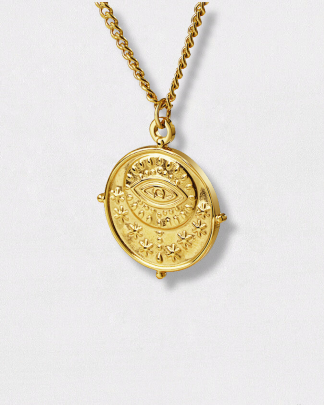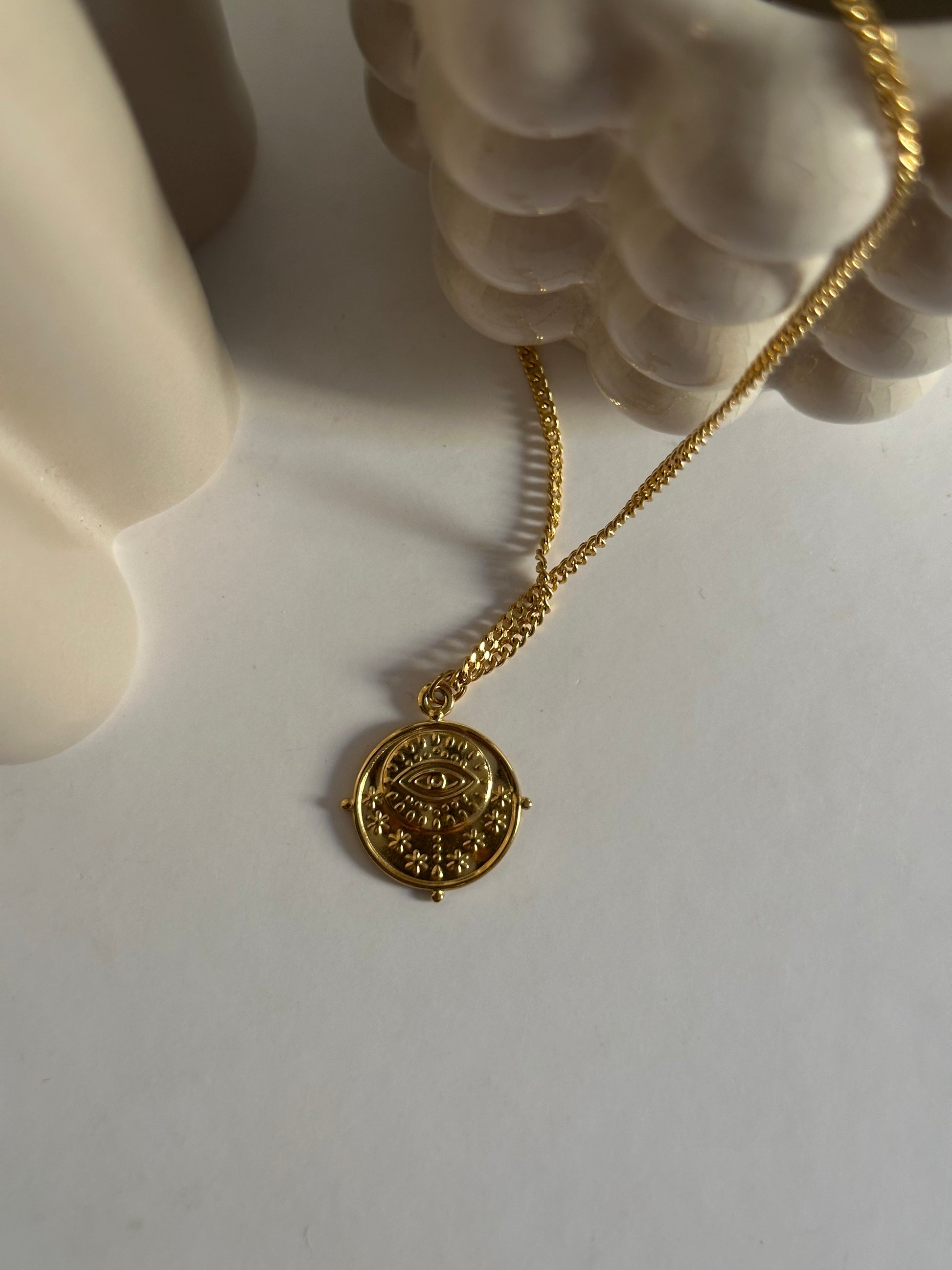 Este elegante collar presenta una medalla con el icónico ojo turco grabado, símbolo de protección y buena fortuna. Con un diseño minimalista pero lleno de significado, esta pieza aporta un toque de misticismo y estilo contemporáneo. La medalla, cuidadosamente trabajada en un acabado dorado, se convierte en un amuleto sutil que puedes llevar día a día para atraer energías positivas. Perfecto para quienes buscan una joya con valor simbólico y estético, este collar es una fusión de tradición y modernidad.