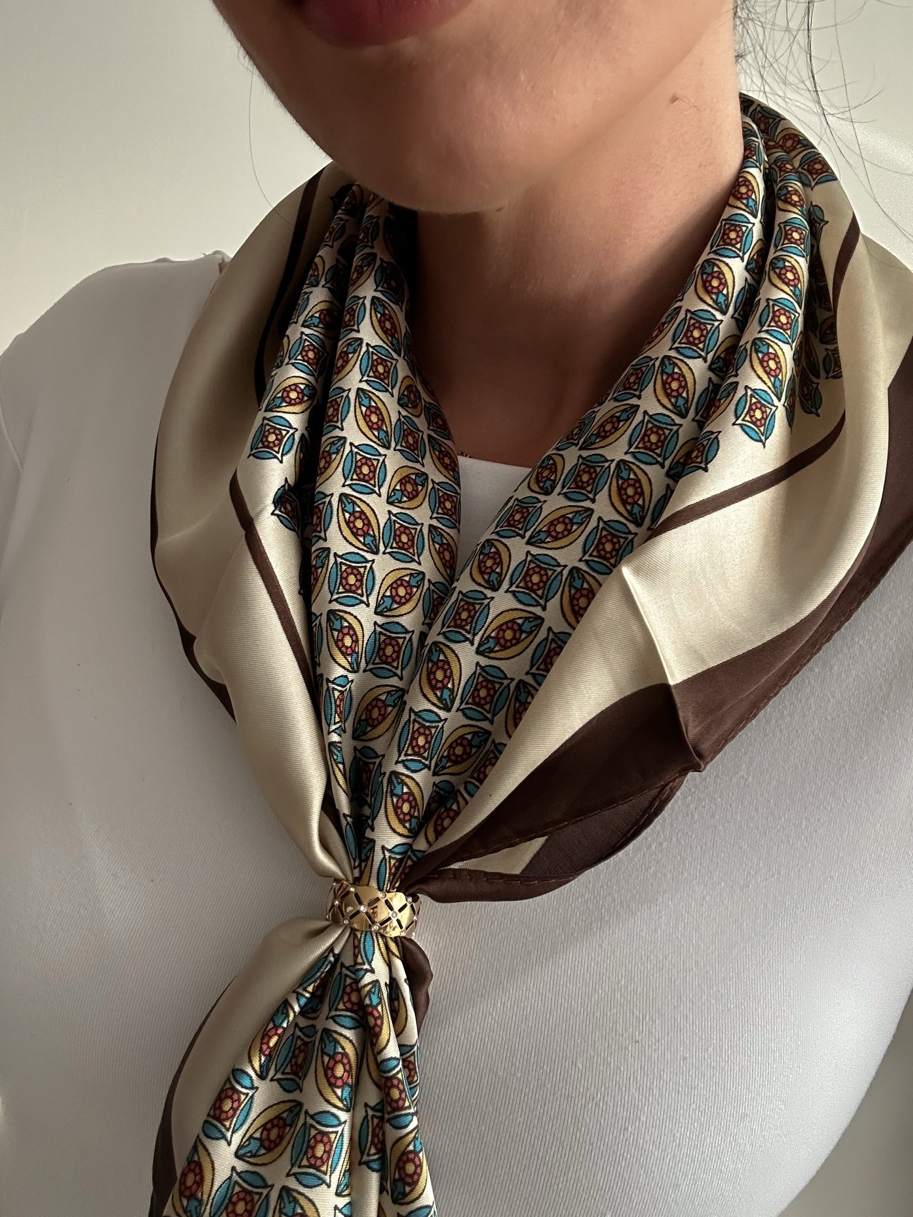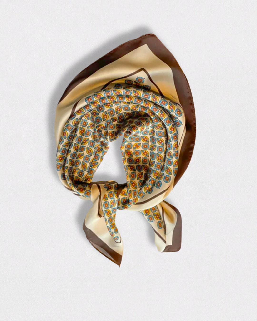 El pañuelo Alma destaca por su diseño geométrico con detalles en azul y burdeos sobre fondo beige, enmarcado por un borde marrón que aporta contraste y calidez.