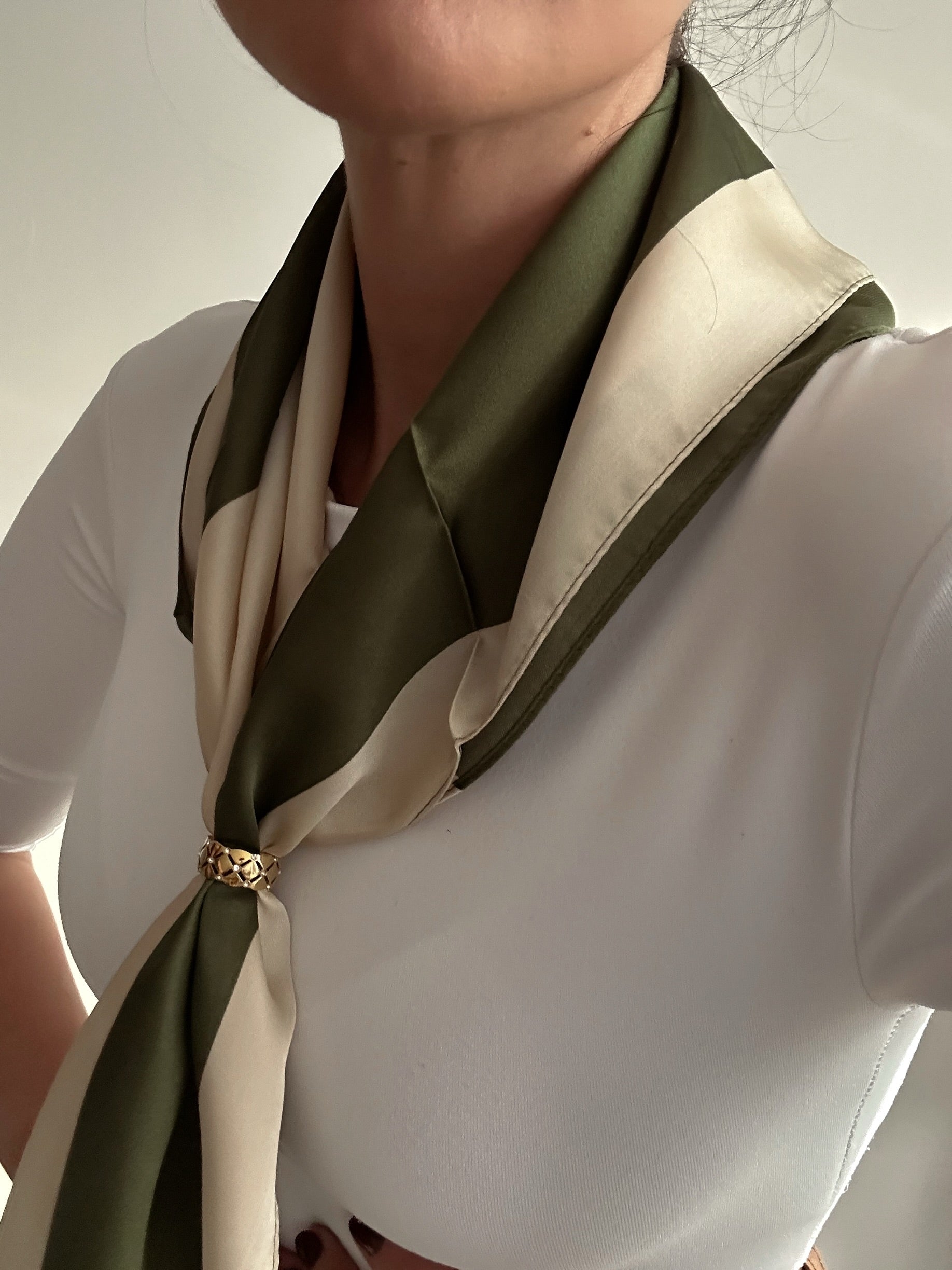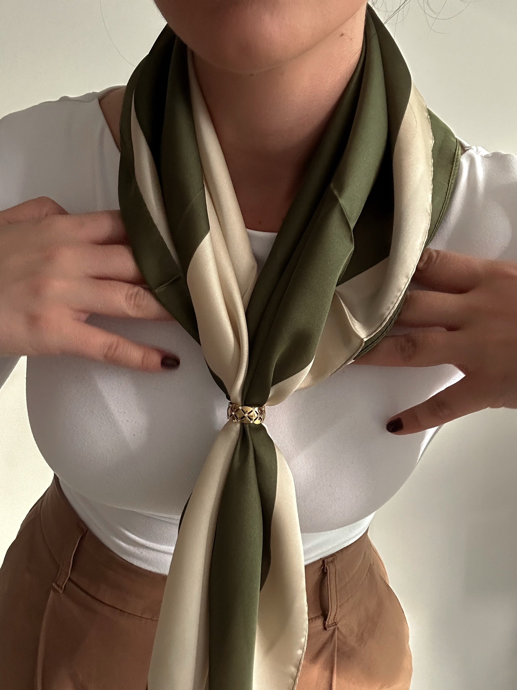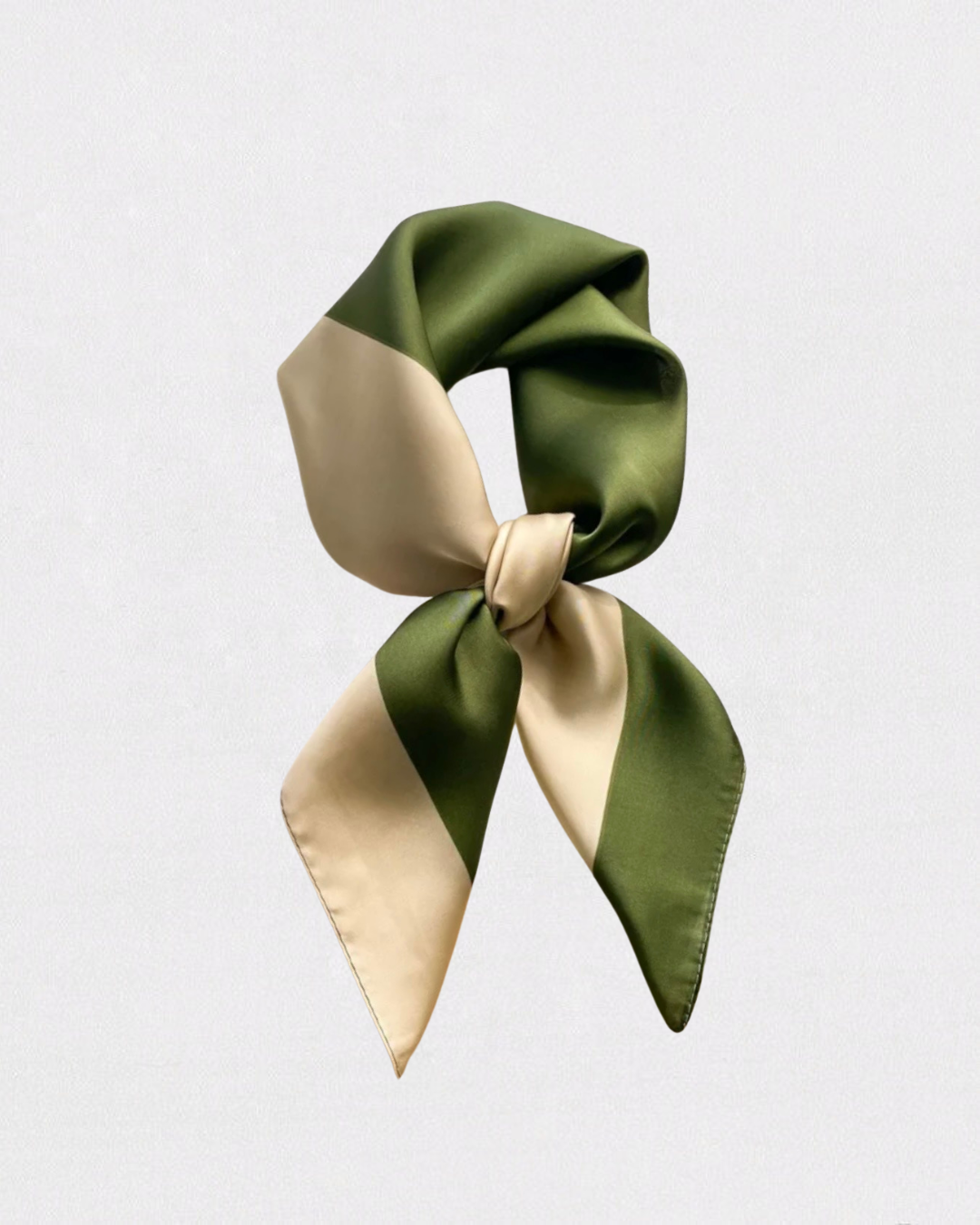 El pañuelo Noa combina un diseño de rayas en tonos verde y beige con un tejido suave y ligero, ideal para uso diario o looks más formales.