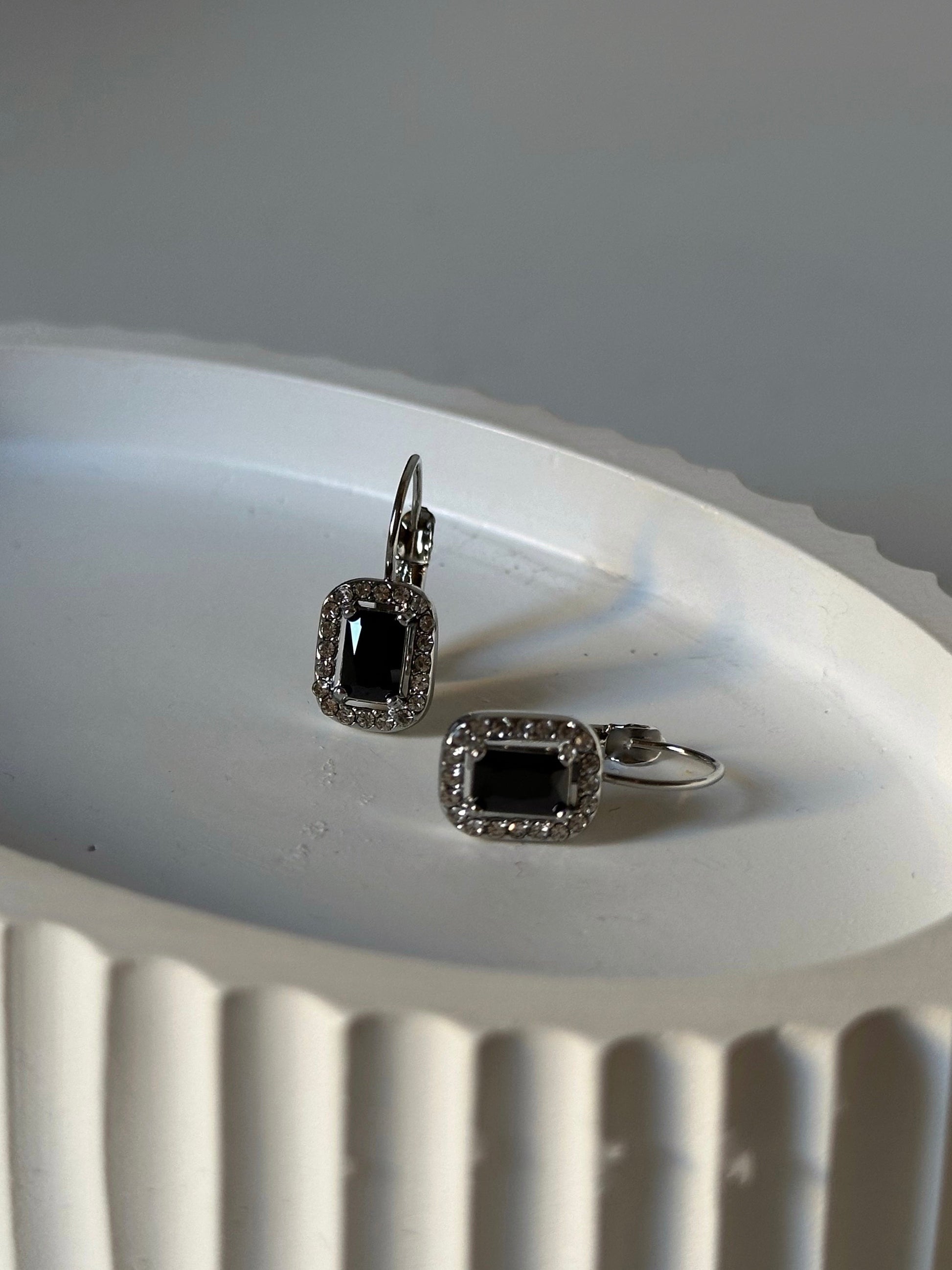 Pendientes con cierre omega, de acero inoxidable y baño de oro de 18K, con preciosas piedras brillantes negras y circonitas.