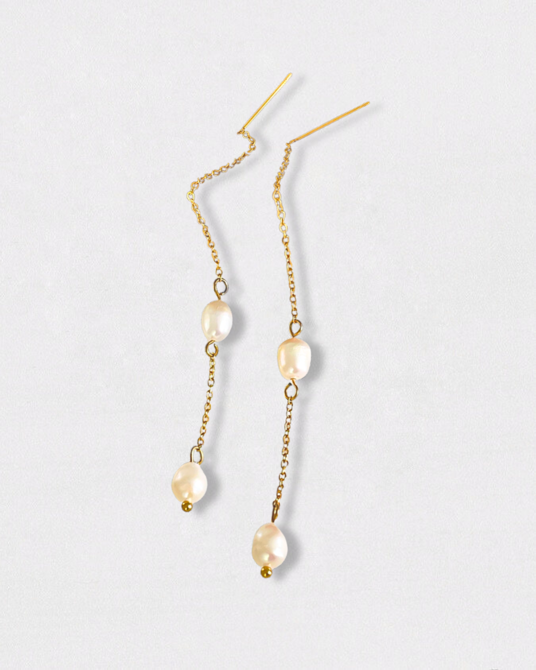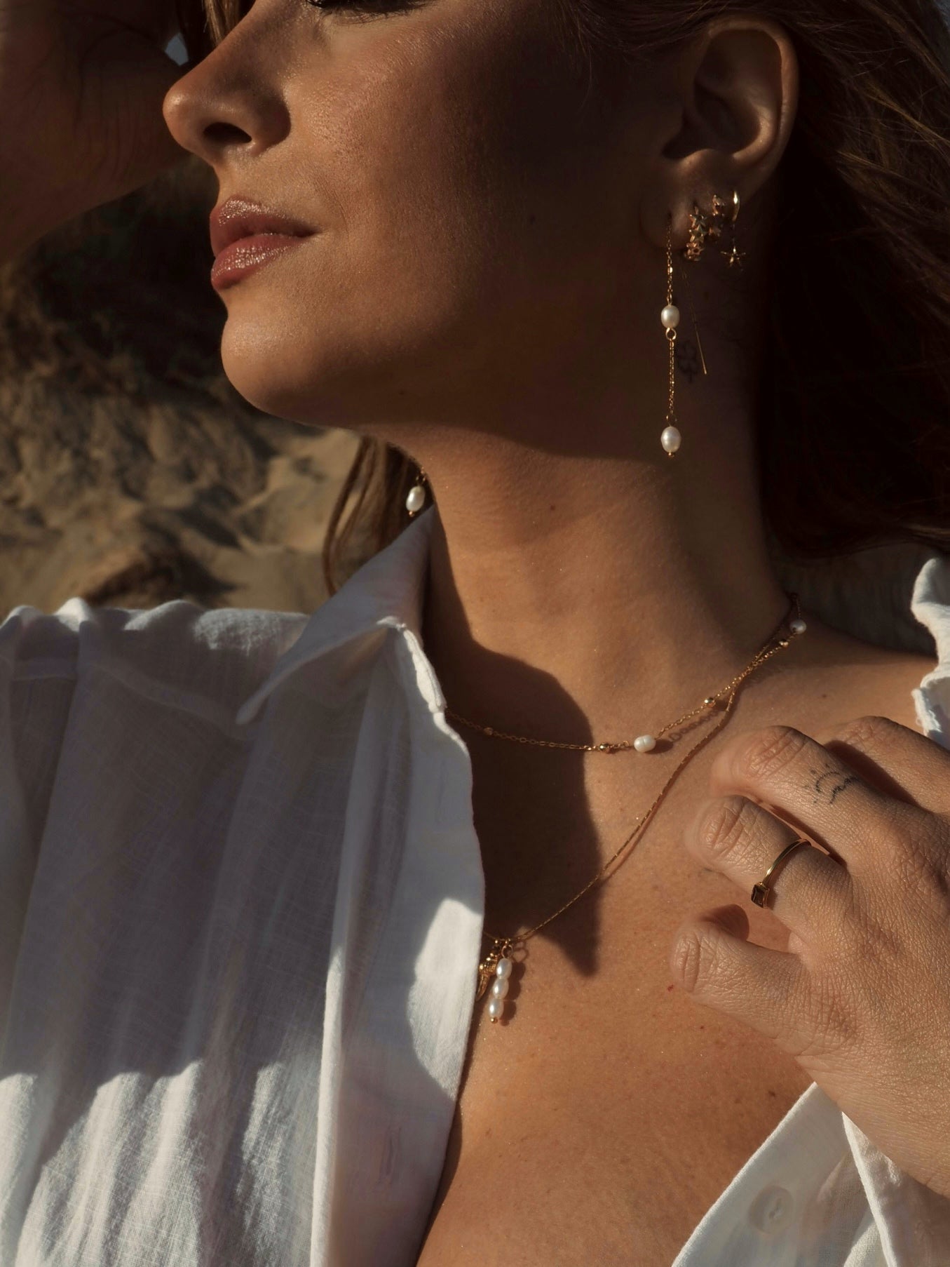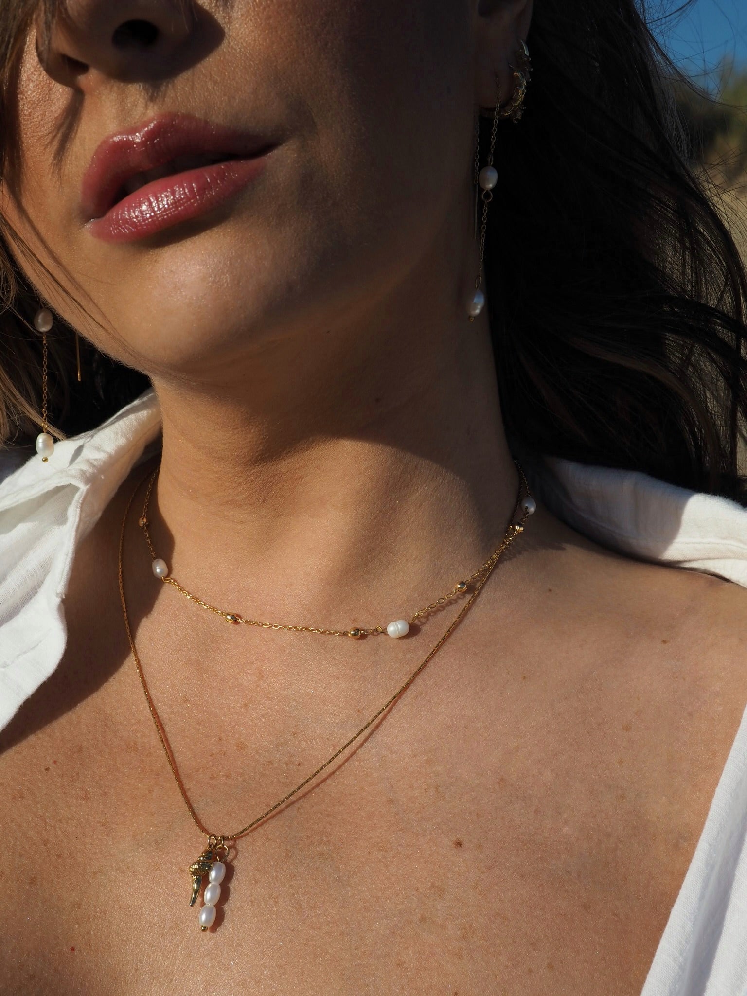 - Material: Acero inoxidable bañado en oro y piedras de agua dulce.
