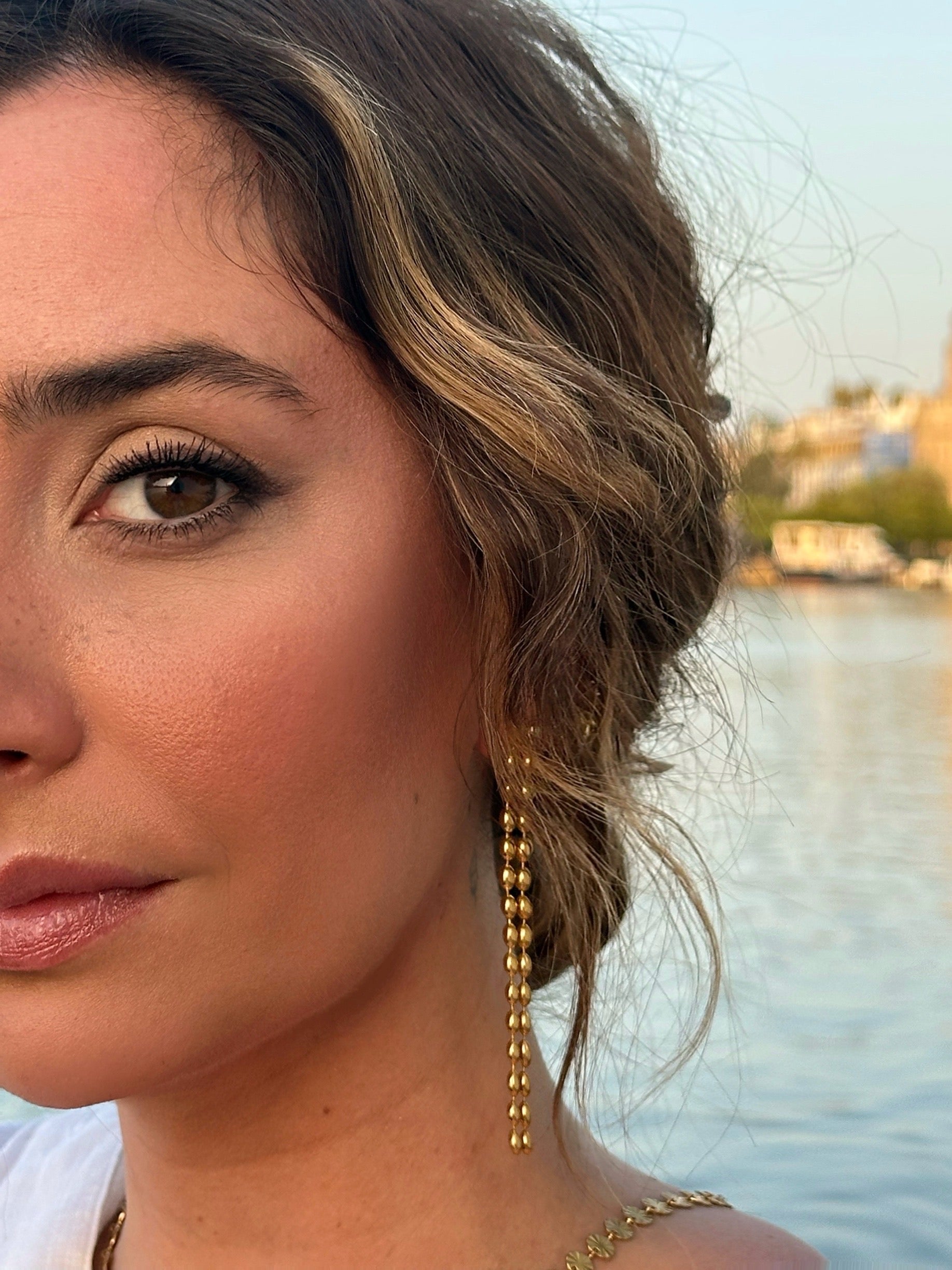 Los pendientes Soletti son el accesorio ideal para quienes buscan pendientes dorados largos que combinen elegancia y estilo. Su diseño en doble caída de cuentas doradas crea un movimiento sutil y luminoso, perfecto para estilizar el rostro y realzar cualquier look.