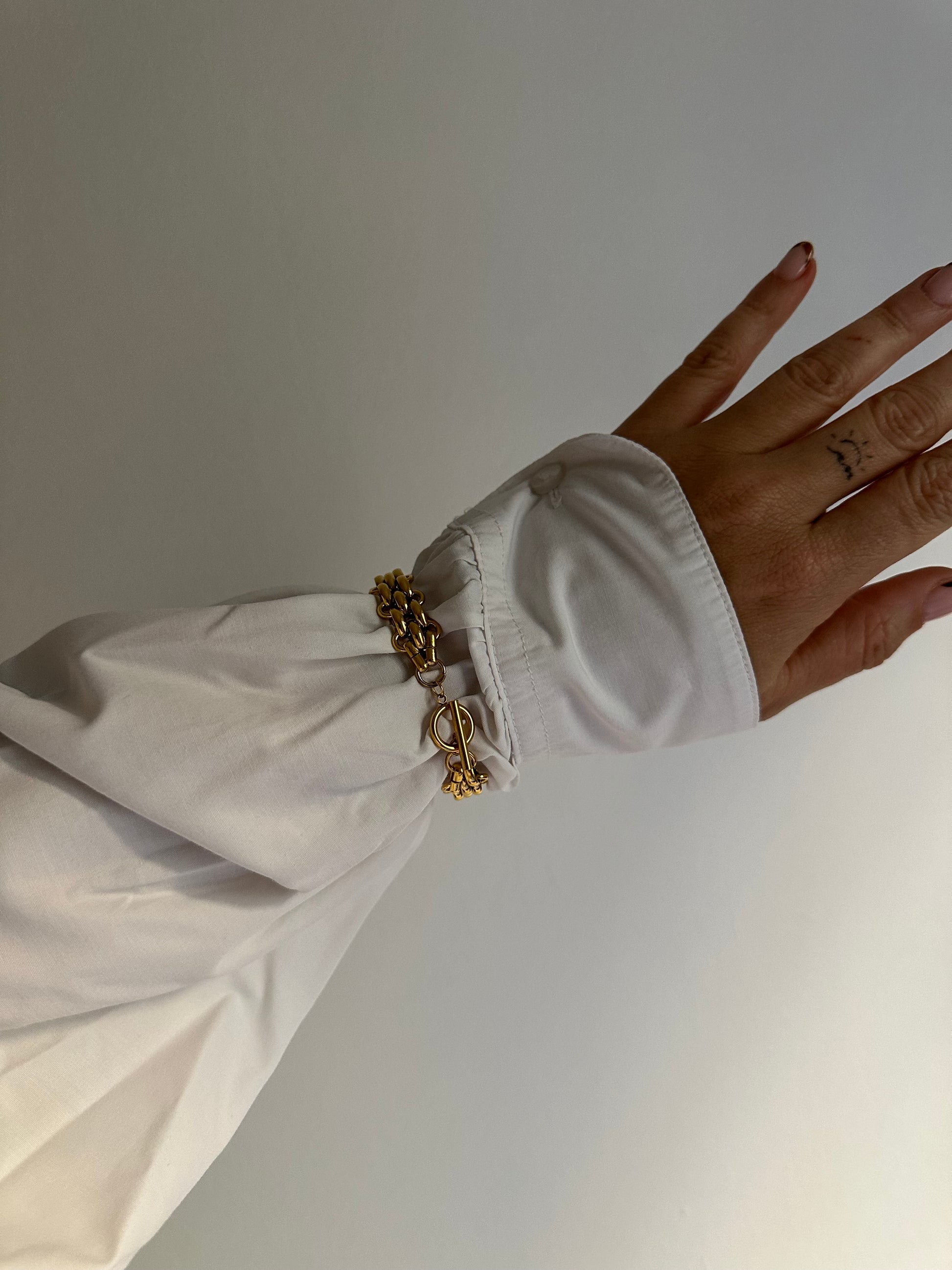Esta pulsera, a juego con el Collar Chunky, de cadena doble en tono dorado ofrece un estilo atemporal y versátil. Su diseño combina eslabones gruesos con un broche de cierre circular que no solo asegura la pieza, sino que añade un toque distinto y moderno.