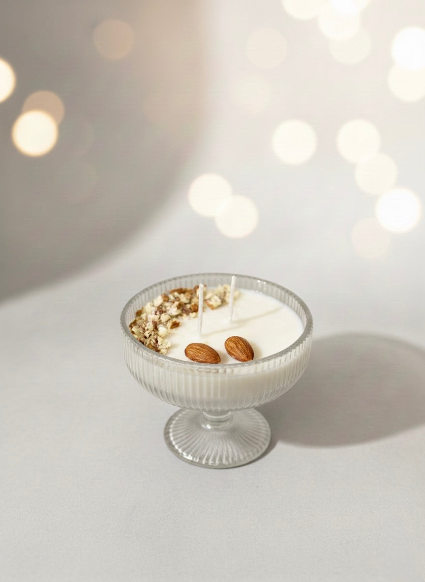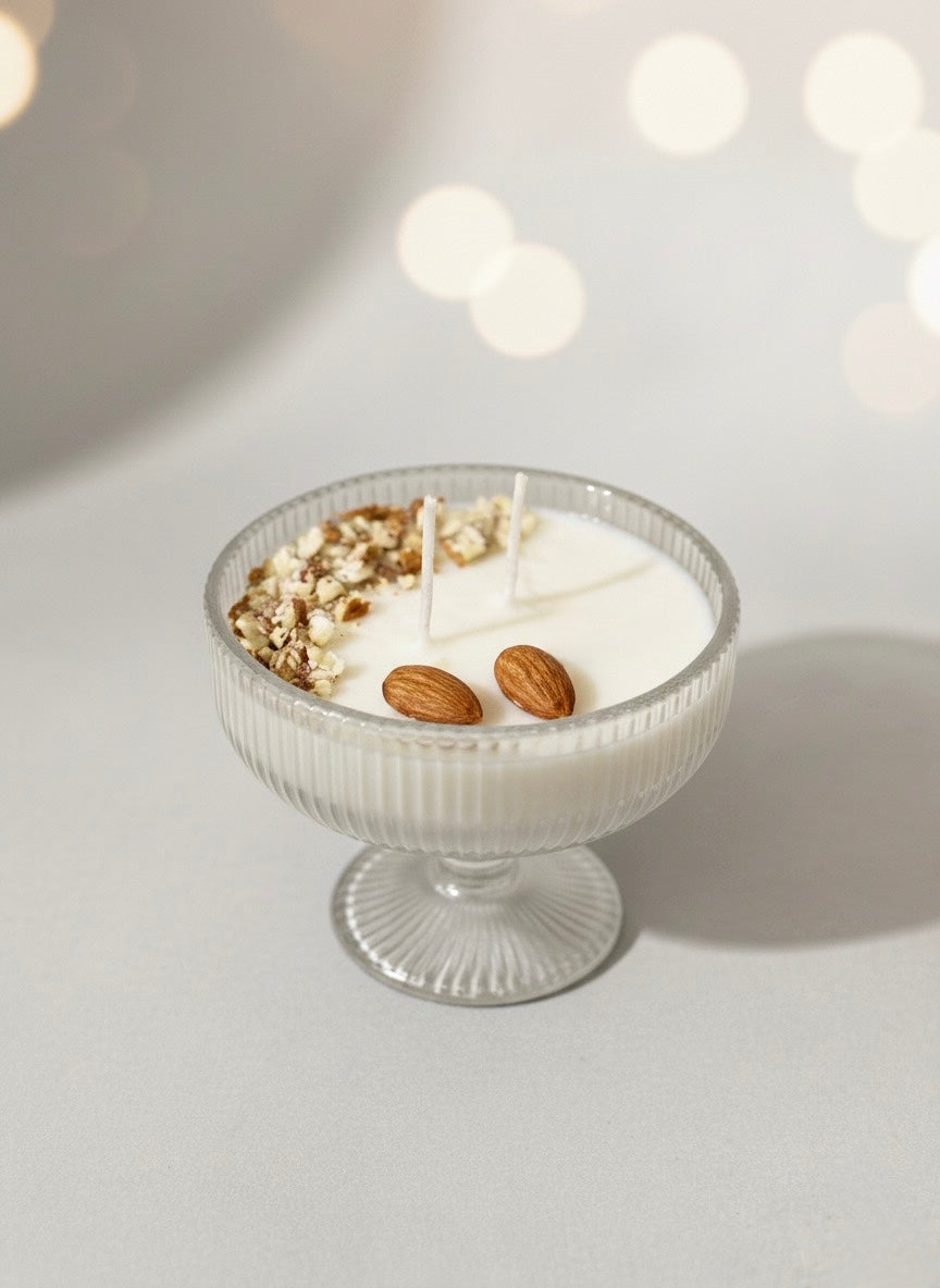 El aroma combina la suavidad de la vainilla con el toque tostado de la almendra, una fragancia cálida y reconfortante que evoca momentos de calma, hogar y dulzura. La decoración con trocitos de almendra añade un toque natural y delicado, convirtiéndola en una vela que no solo perfuma, sino que también decora.